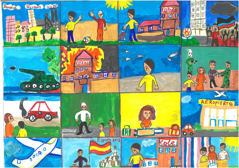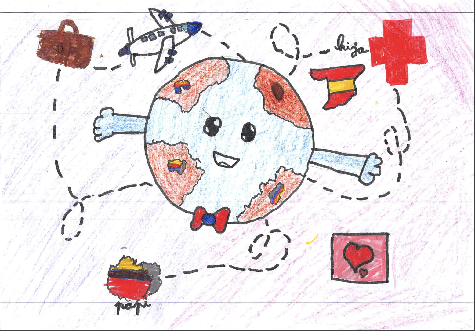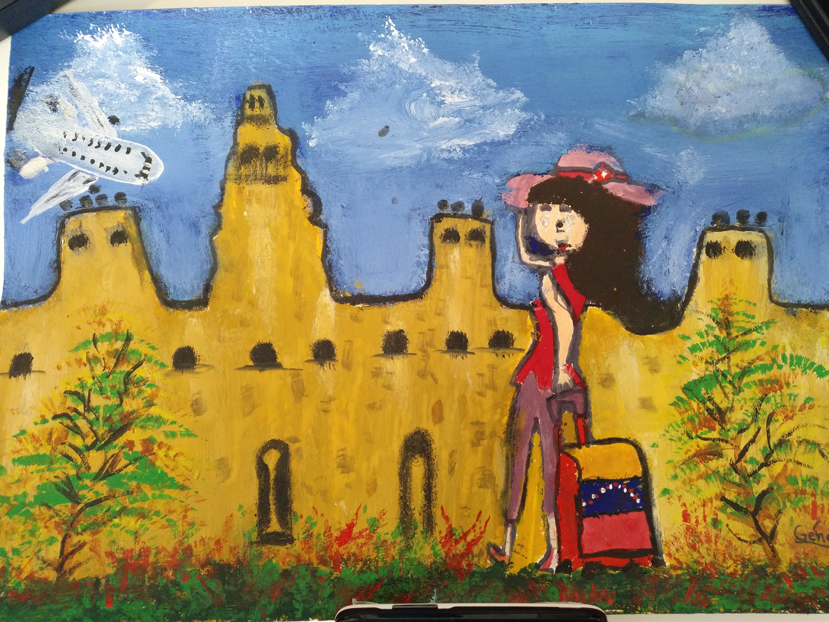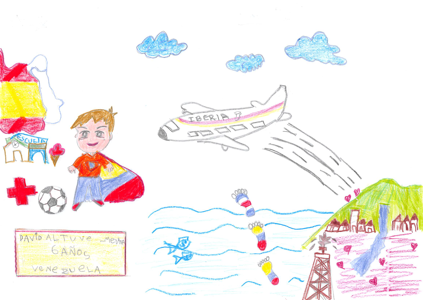 Representa su viaje desde que sale de Venezuela (se observa el Ávila, montaña emblemática de Caracas, el río Guaire que la atraviesa y un pozo petrolero que representa al país con las mayores reservas del mundo). Se ve cierta tristeza. Varios corazones quedan regados en la tierra. Luego un avión que despega y deja unas huellas en varios países desde donde estuvo (Venezuela, Colombia, Costa Rica). Llega a España que lo recibe de frente con su fútbol, su escuela, su Cruz Roja y su diversidad. Un viaje que sufrimos y gozamos como familia y nos mantiene fuertes y agradecidos.