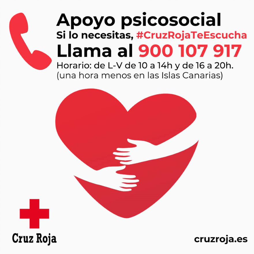 Desde el equipo de Cruz Roja te escucha, animamos a todas las personas que necesiten un apoyo emocional o que se encuentren en situación de soledad, a que nos llamen. Las llamadas son gratuitas y se encuentra en funcionamiento de lunes a viernes en horario de atención de 10:00h a 14:00h y de 16:00h a 20:00h (una hora menos en Canarias).
