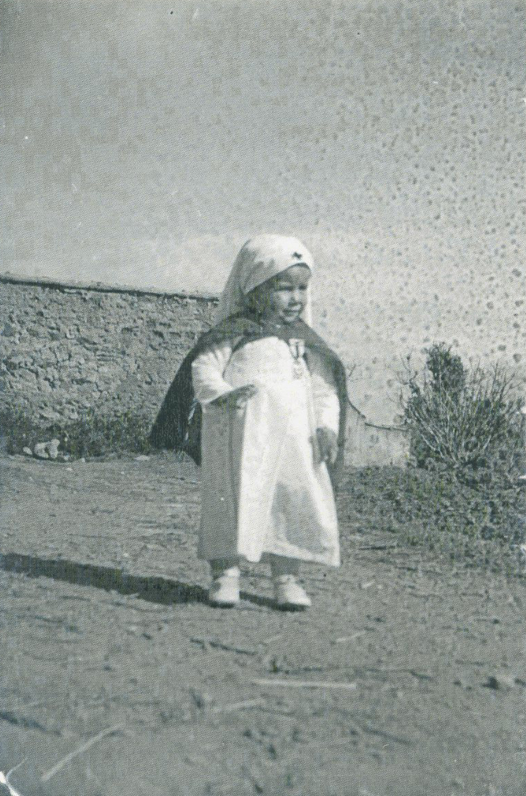 Lo es. Según me explica Teresa, la foto la tomó su abuelo en el municipio de Encinacorba poco después del estallido de la Guerra Civil. “Mi abuelo añoraba muchísimo a la Cruz Roja y el trajecito lo preparó él mismo con ayuda de mi abuela. La medallita que lleva mi madre en la batita era de las pocas cosas que conservaron”.