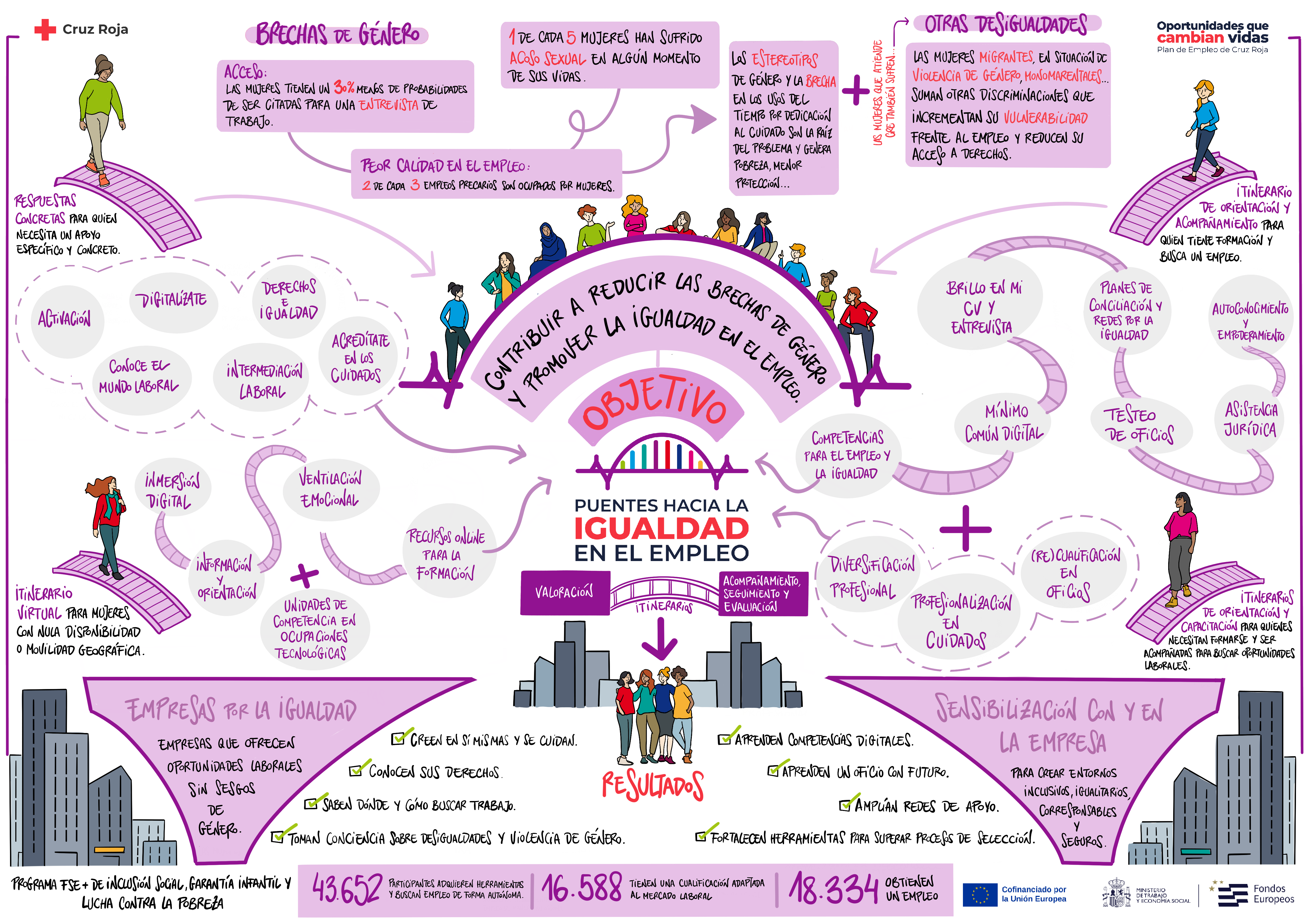 Puentes por la Igualdad en el Empleo es un proyecto que busca reducir las desigualdades de género y acompañar a mujeres que enfrentan múltiples formas de discriminación. El objetivo final es que estas mujeres recuperen su autonomía, ejerzan plenamente sus derechos y accedan a oportunidades laborales decentes en igualdad y reduciendo la feminización de la pobreza presente y futura.