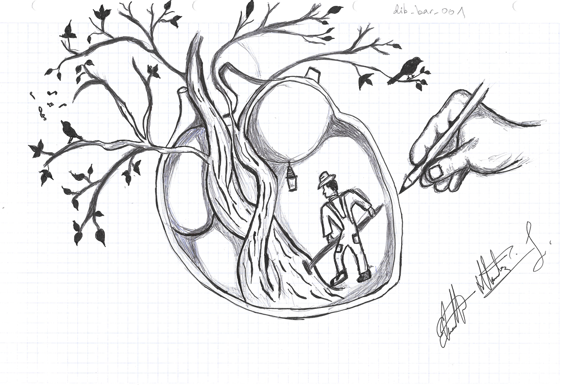 A través de este dibujo realizado en acuarela, intento transmitir una idea sobre mi situación actual en España. Expresando la existencia de un lugar que no tiene fronteras claras, y sus elementos y colores se funden con los elementos del fondo del cuadro, y a pesar de ello, sigue representando la forma del hogar o cobijo. En cuanto al libro que existe en el dibujo, es un indicio de la oportunidad que tuve de estudiar un máster en la Universidad de Granada.
