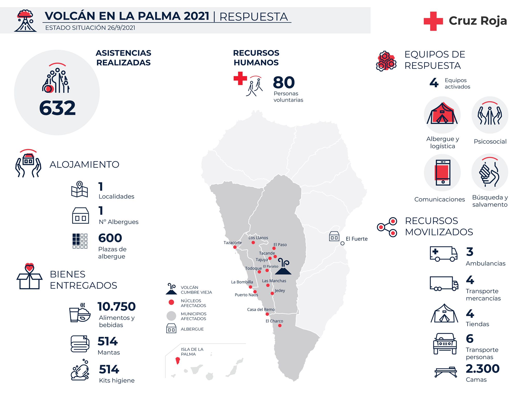 Desde el pasado 19 de septiembre, Cruz Roja atiende a las personas desalojadas en la isla de La Palma en un albergue provisional desplegado por su Equipo de Respuesta Inmediata en Emergencias (ERIE), en El Fuerte de Breña Baja, una instalación que actualmente tiene capacidad para atender a 600 personas. Por este albergue habían pasado a fecha 22 de septiembre 414 personas. Además, se habían realizado 12 traslados sanitarios y 28 evacuaciones de personas con movilidad reducida. En total, a 27 de septiembre se han realizado 632 asistencias.