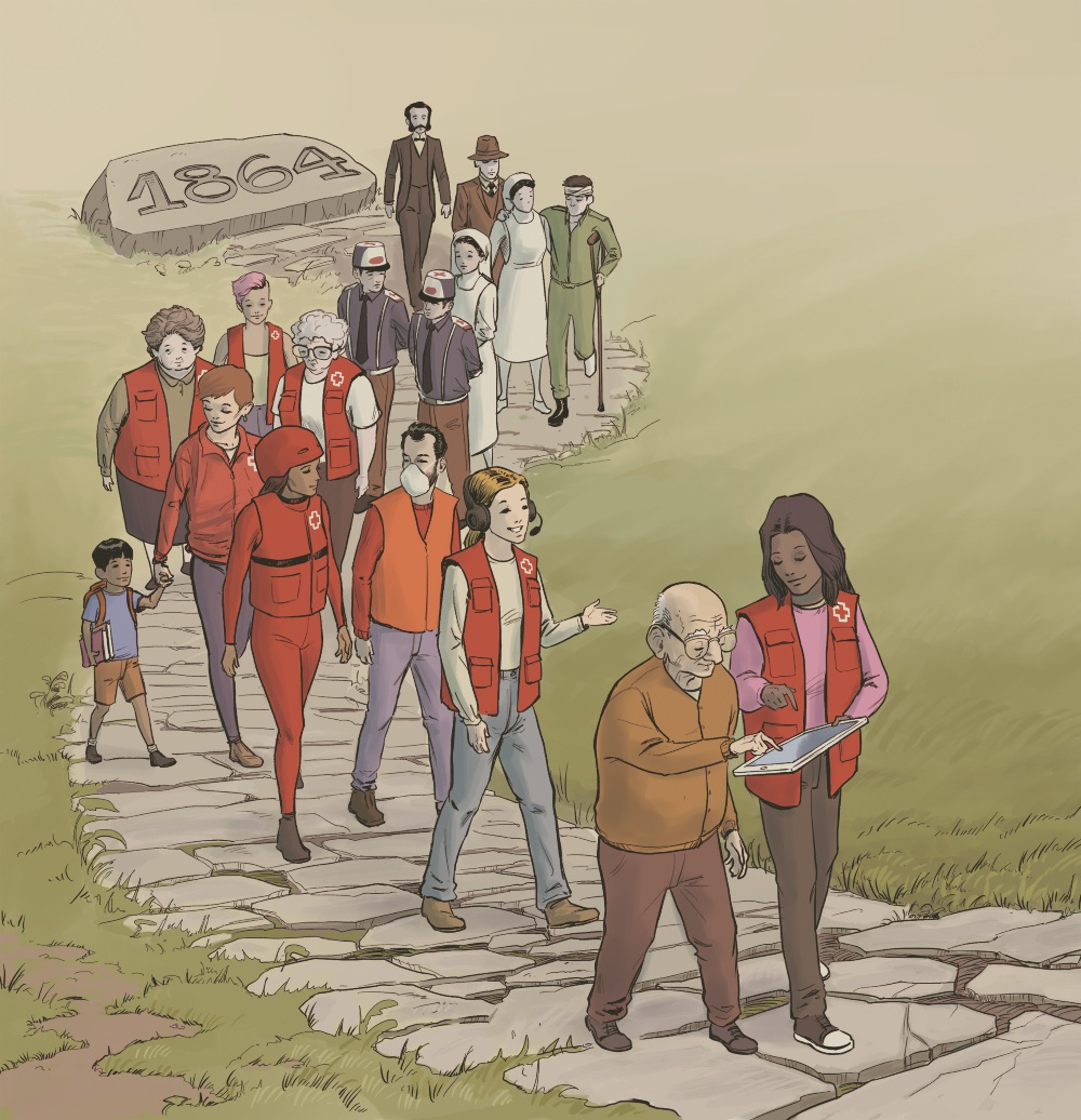 Alejandro Artesero es un ilustrador e historietista albaceteño, que ha trabajado para revistas y productoras de cine en Italia y Reino Unido. En esta ilustración Alejandro representa los 160 años de historia de Cruz Roja Española como un camino que empezó su fundador Henry Dunant en 1864, por el que más de siglo y medio después continúan transitando miles de voluntarios y voluntarias.