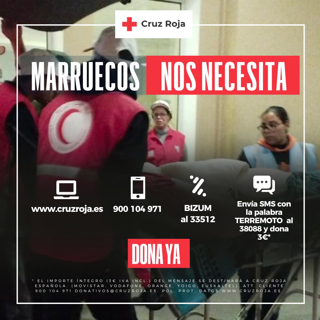 - Más de 2.100 personas han perdido la vida y más de 2.400 han resultado heridas en el terremoto que sacudió Marruecos el pasado viernes por la noche. Desde Cruz Roja Española se ha abierto una campaña de captación de fondos y se ha puesto a disposición de la Media Luna Roja para prestar apoyo a la población afectada, a través del envío de artículos de primera necesidad y el apoyo financiero.