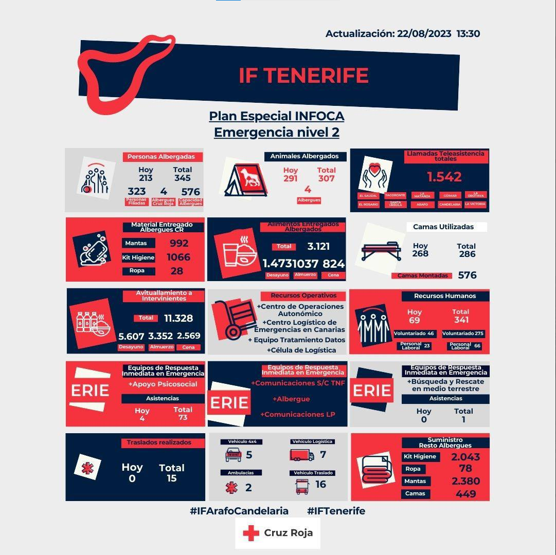 - Un total de 341 personas de Cruz Roja y 33 vehículos se han movilizado en el incendio de Tenerife para dar respuesta a las personas y animales evacuados de las zonas afectadas, así como apoyar a las brigadas forestales en caso de necesitar asistencia sanitaria y evacuación, mediante la movilización de sus Equipos de Respuesta Inmediata en Emergencias (ERIE). Aunque ya se han cerrado 4 de los 5 albergues habilitados, Cruz Roja continúa ofreciendo avituallamiento a intervinientes y dando apoyo a las brigadas forestales por si llegasen a necesitar asistencia sanitaria o evacuación