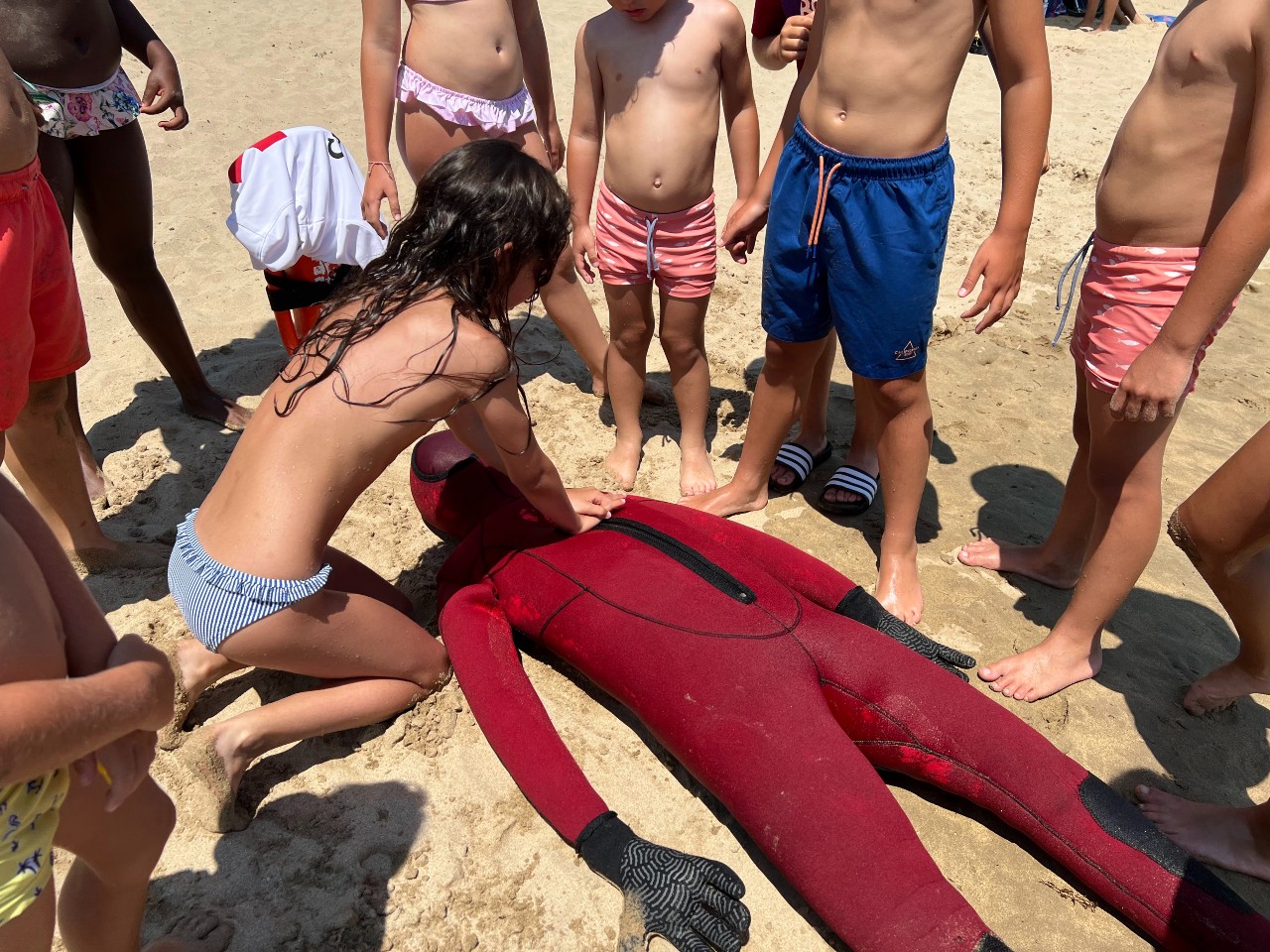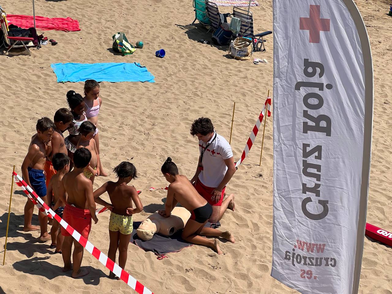 Cada día, un equipo (compuesto por dos monitores de talleres que son socorristas, y tres voluntarios/as) se desplaza a una playa. A primera hora de la mañana hacen análisis de riesgos y situación de la playa, y desde las 12 hasta las 15h el equipo sensibiliza a las personas usuarias en los riesgos de la playa y da pautas básicas sobre primeros auxilios. Las actividades pueden ser grupales o individuales, y se realizan prácticamente de toalla en toalla.