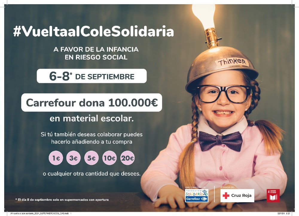 - Una campaña de recogida de material escolar que arranca con la donación directa por parte de Carrefour de 100.000 euros en material escolar; aportación con la que se estima poder dar cobertura a las necesidades básicas, en material escolar, de miles de niñas y niños en situación de vulnerabilidad social.
