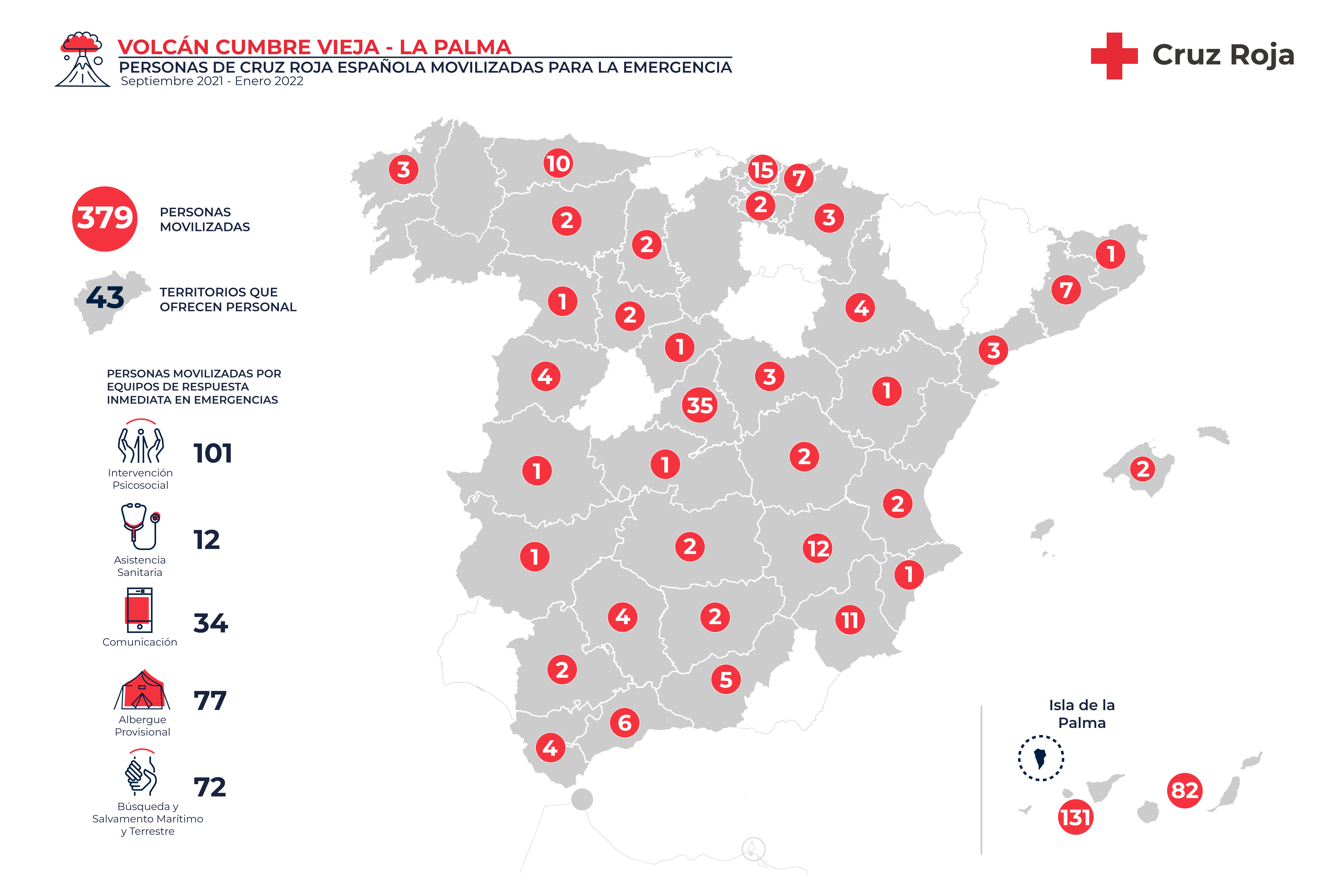 - Cinco meses después de que el volcán de Cumbre Vieja entrara en su erupción, Cruz Roja pone fin al despliegue de personal y recursos de respuesta en emergencia. Pero esto no significa que la ayuda cese, puesto que los planes de recuperación siguen adelante, y la Organización continuará apoyando en la isla de La Palma para paliar y mitigar los daños personales y materiales producidos por esta crisis.