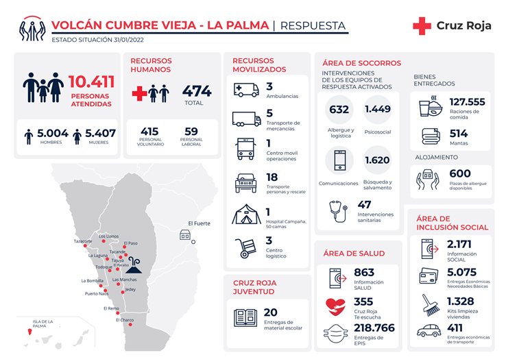 Mediante su principio de Humanidad, Cruz Roja tiene como objetivo “prevenir y aliviar el sufrimiento humano en todas las circunstancias”. Como consecuencia, cuando el volcán de Cumbre Vieja estalló, la Organización puso todo de su parte (rescate y asistencia en el medio terrestre; recursos para realizar atenciones psicosociales, psicológicas y de apoyo económico; evacuaciones; tareas de desalojo; traslados y filiación de personas; despliegue de ERIEs; albergues provisionales…) para atender a la grave crisis que azotó a un 40% de municipios de la isla de La Palma y ocasionó que 7.000 personas fueran evacuadas, que 1.293 edificaciones fueran impactadas, que se vieran afectadas 58.361 carreteras y fueran dañadas 274,7 hectáreas de cultivo.