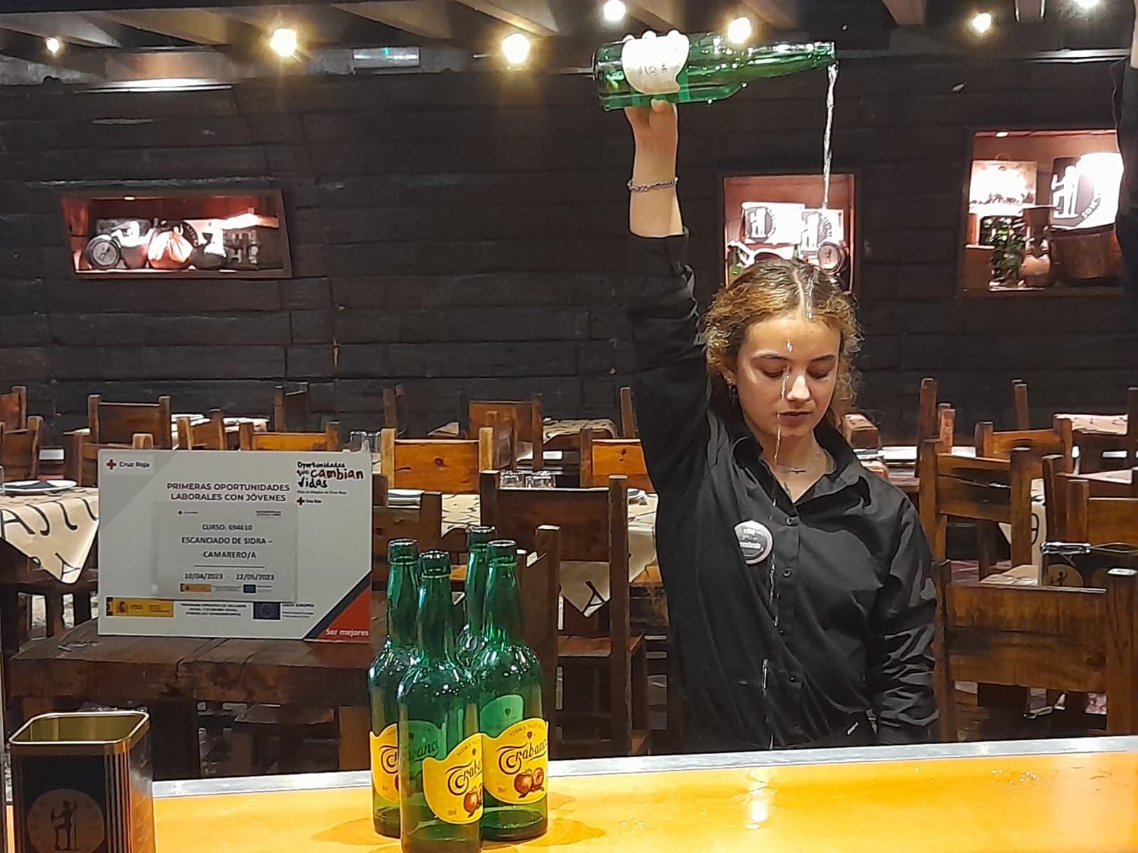Escanciar sidra es una tradición asturiana con siglos de historia que puede convertirse en todo un espectáculo digno de ver. Es uno de los oficios, precisamente, que se enseña en los cursos de Escanciado de Sidra - Camarero/a y Ayudante de Cocina Asturiana de Cruz Roja en Asturias; formaciones enmarcadas en el Proyecto de Primeras Oportunidades Laborales con Jóvenes y que tienen como objetivo cualificar a jóvenes en ocupaciones altamente demandadas en el mercado asturiano.