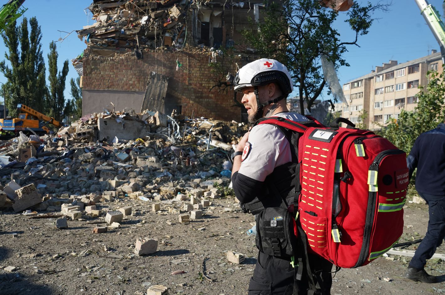 Maksym (42 años) y Oleksandra (36) eran diseñadores gráficos en Mykolaiv antes de que el estallido de 2022 lo cambiara todo. Hoy ejercen el voluntariado en el equipo de respuesta de Cruz Roja Ucraniana en Kiev. Han vivido el dolor de la separación (los hijos de Maksym, de un matrimonio anterior, están en Francia) y la pérdida de compañeros bajo los escombros. “Lo más duro no es ver la muerte, sino la familia que espera con la esperanza de recibir buenas noticias”, confiesa Maksym.