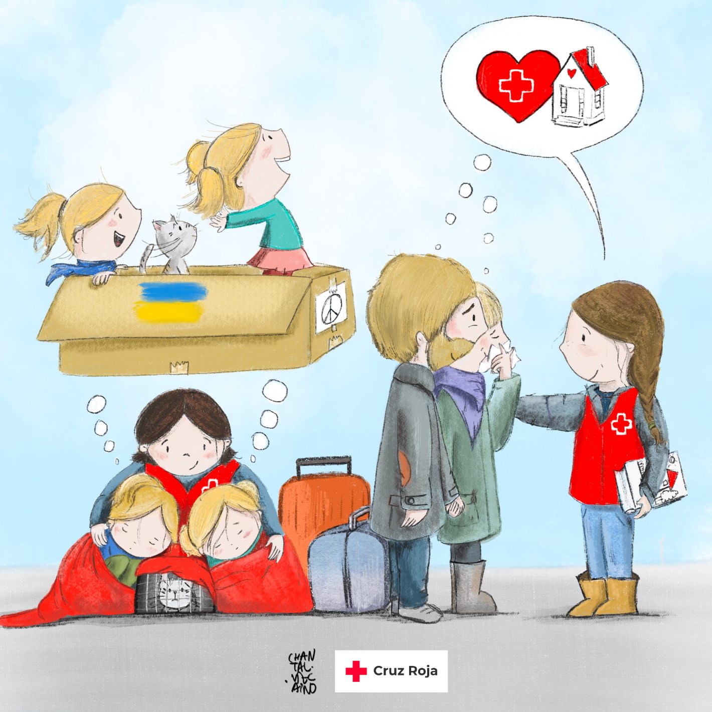 Chantal Vizcaíno es una ilustradora, pintora y cronista gráfica catalana que también se define como “artivista” (artista + activista) por su compromiso y sensibilidad con numerosos temas sociales. Sus ilustraciones, de esta manera, ponen el foco en cuestiones como las desigualdades sociales, las migraciones o la emergencia climática. Trabaja también en comunicación, educación y derechos humanos. En esta viñeta, Vizcaíno explora lo importante que es tender una mano amiga en momentos complicados y abrazar la esperanza de un futuro mejor. La viñeta está enmarcada dentro del proyecto #EU4Health. La Federación Internacional de Sociedades de la Cruz Roja y de la Media Luna Roja (FICR), en calidad de coordinadora, junto con las Sociedades Nacionales de la Cruz Roja en 25 países y con el apoyo del Centro de Referencia para el Apoyo Psicosocial (PS Centre) de la FICR, tiene como objetivo proporcionar apoyo integral a más de 590.000 personas durante un periodo de tres años a través del proyecto EU4HEALTH. Proyecto financiado por la Unión Europea.