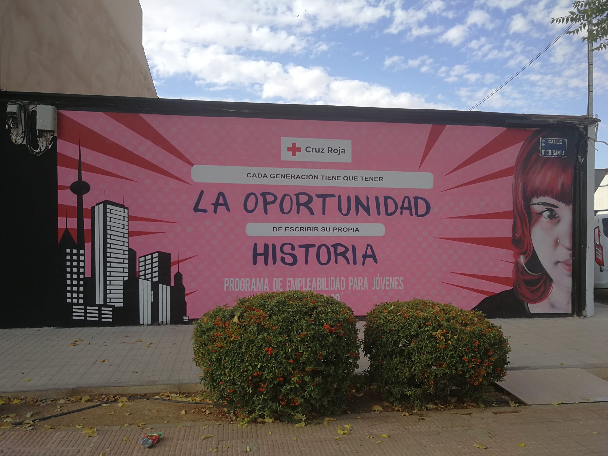 Cruz Roja en Tomelloso impulsó este un mural, una iniciativa donde se insta a la juventud a ser protagonista de su proceso de inserción laboral tomando conciencia sobre su propia vida y a ser responsables de tomar sus propias decisiones. El responsable de la intervención, realizada en colaboración con el Ayuntamiento de Tomelloso, fue el reconocido y experimentado artista tomellosero Roberto Carretero Casero, que se impicó generosamente y desde el principio en esta actividad, que lleva por título título ‘Cada generación tiene que tener la oportunidad de escribir su propia historia’.