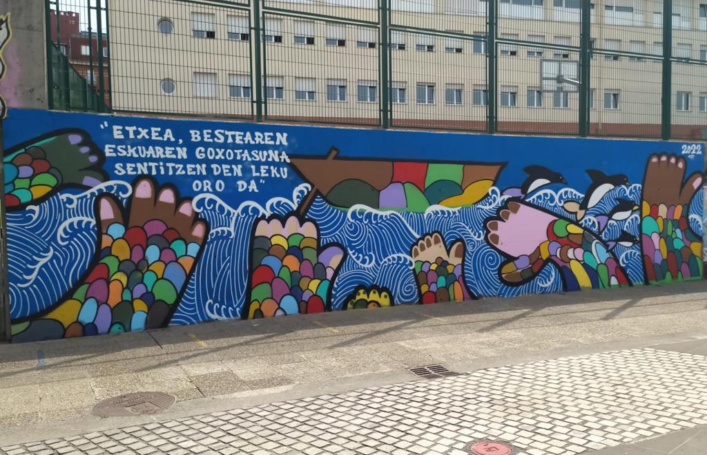 Este mural fue creado con motivo del Día Mundial de las personas refugiadas y elaborado por las personas participantes del programa en Intxaurrondo, con la ayuda del muralista Iñaki Saez (@inakisaezhrndz).