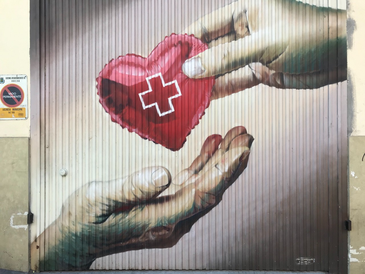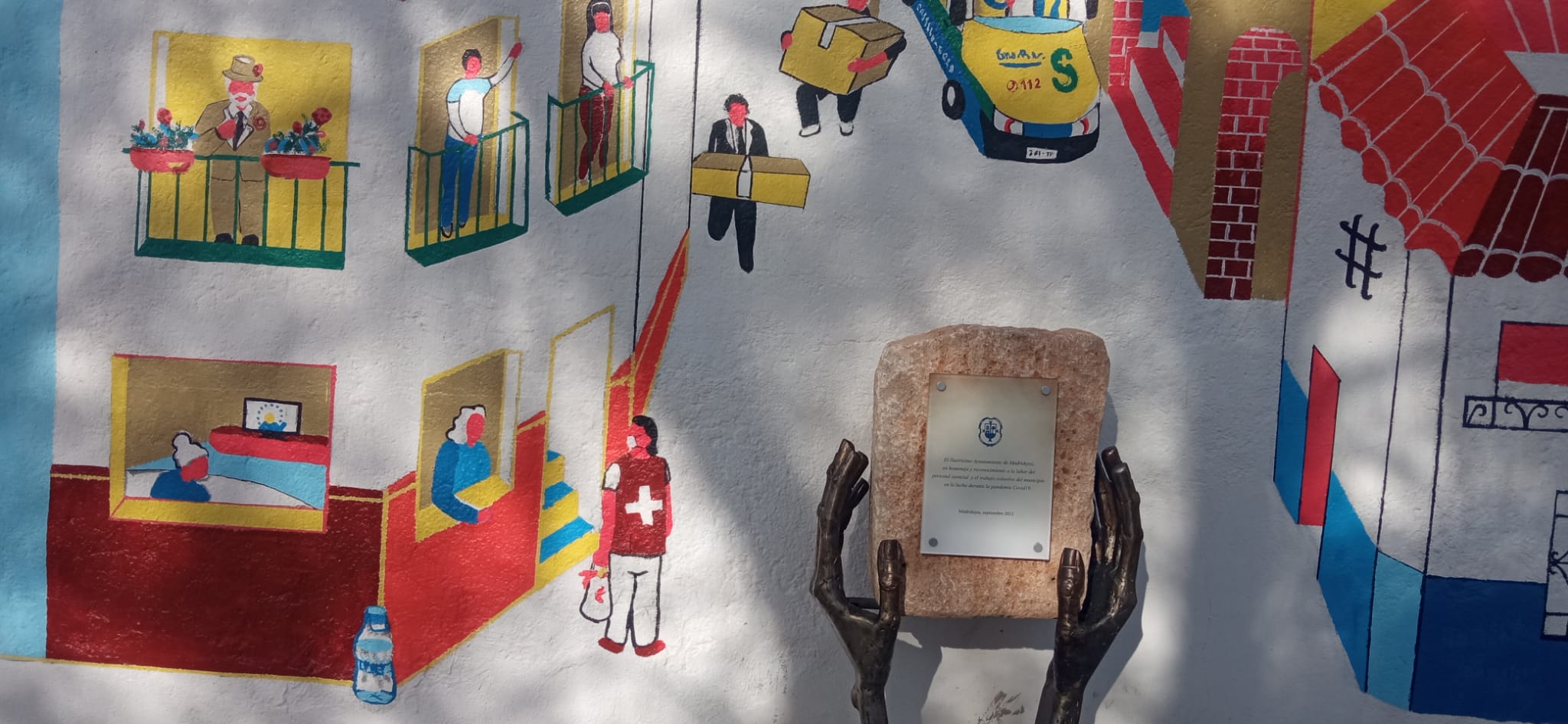 En ocasiones, las pinturas murales que ocupan las calles no las realiza Cruz Roja, pero la presencia de la Organización está tan arraigada en la sociedad que no es raro encontrarla representada. Esta pintura fue realizada por el ayuntamiento de la localidad toledadana de Madridejos en septiembre del 2021 en homenaje y reconocimiento a la labor del personal esencial durante el COVID 19. Por allí, como no podía ser de otra manera, aparece Cruz Roja.