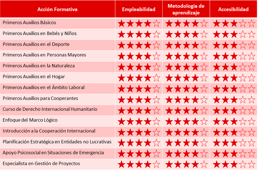 En el siguiente cuadro se pueden ver todos los cursos que hasta la fecha tiene la Cruz Roja reconocidos por este certificado, así como las estrellas obtenidas en cada uno de ellos.