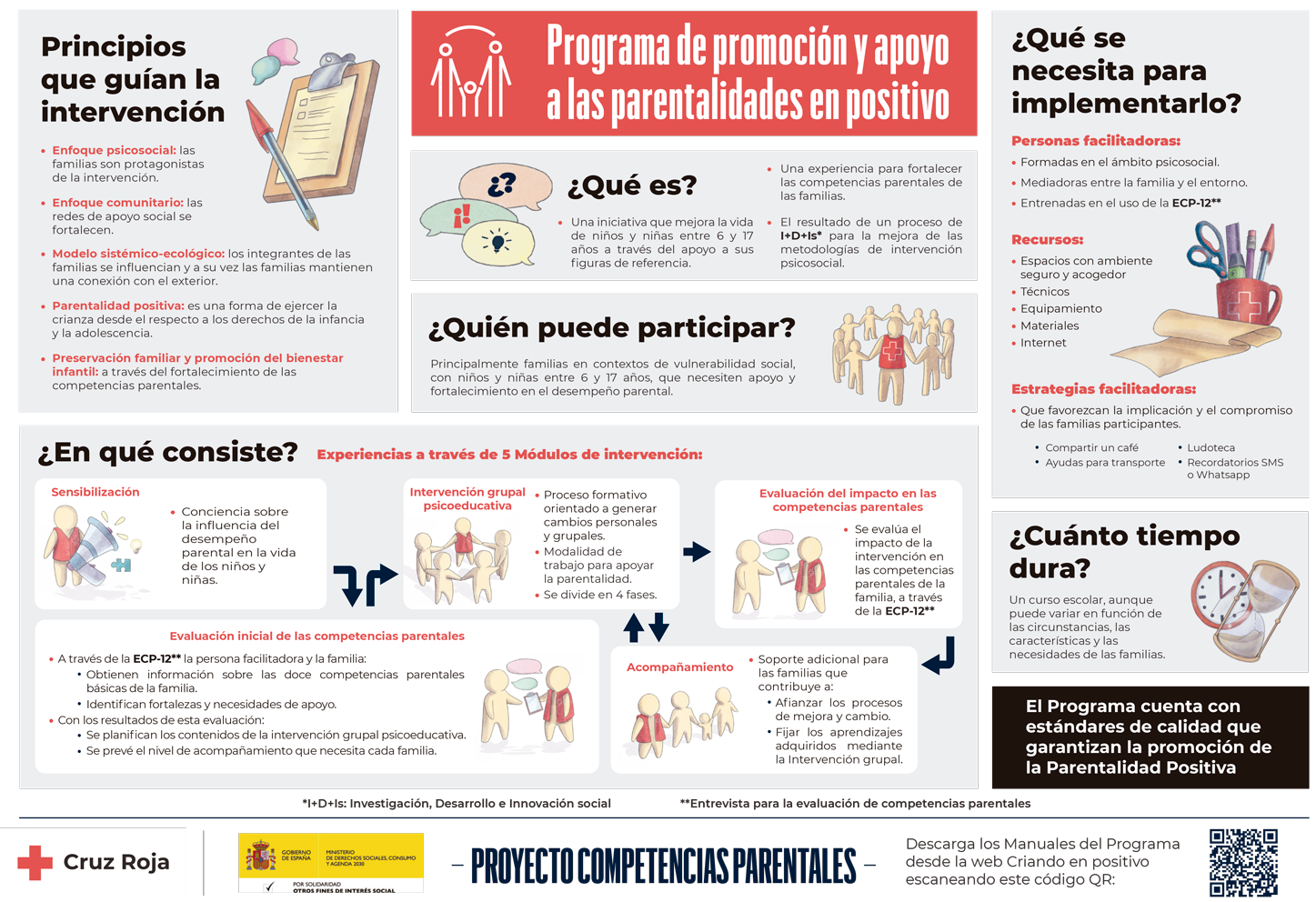 El PROGRAMA DE PROMOCIÓN Y APOYO A LAS PARENTALIDADES EN POSITIVO es una propuesta para fortalecer a padres, madres o personas que ejercen esta función, en sus prácticas de crianza, educación y socialización de niños y niñas entre los 6 y los 17 años, que permite a los servicios de preservación familiar, ofrecer una intervención integral y de calidad, basada en la parentalidad positiva y la mejora de las competencias parentales. Para su adecuada implementación, las y los profesionales cuentan con un Manual técnico, en el que se detallan aspectos teóricos y metodológicos esenciales para su preparación y puesta en marcha y un Manual de aplicación, que recoge la descripción detallada de las sesiones que componen el Programa, incluidas las orientaciones operativas.