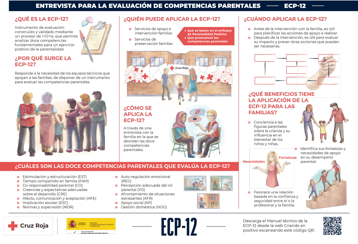 La ENTREVISTA PARA LA EVALUACIÓN DE COMPETENCIAS PARENTALES (ECP-12) es una herramienta validada para población en situación de vulnerabilidad social, que permite a través de la evaluación rigurosa de doce competencias parentales, analizar y comprender las necesidades de apoyo a la parentalidad de las familias con niños o niñas a su cuidado, así como, identificar sus potencialidades y capacidades para la crianza y educación. La ECP-12 es el resultado de la colaboración entre Cruz Roja y la Facultad de Psicología de la Universidad de Sevilla, y el apoyo del Ministerio de Derechos Sociales y Agenda 2030 en el marco de un proceso I+D+Is cuyo resultado se presenta en el Manual Técnico. El uso y aplicación de la ECP-12 hace parte de las actividades incluidas en el Programa de promoción y apoyo a las parentalidades en positivo.