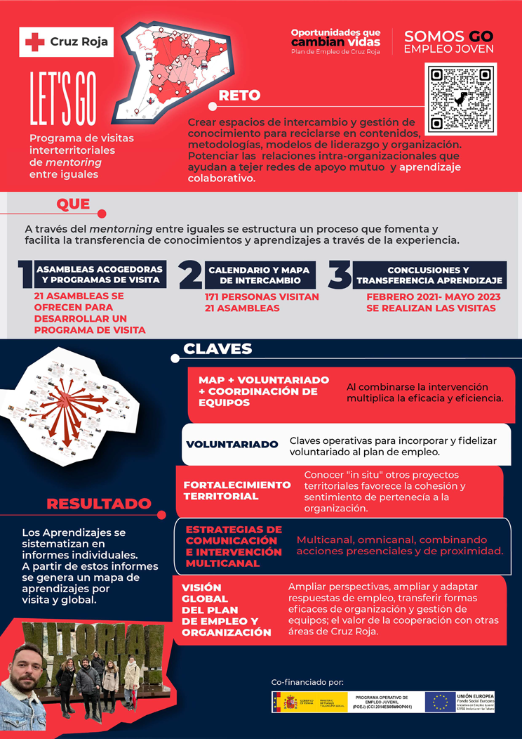 Con el objetivo de crear espacios de intercambio y gestión de conocimiento, se desarrolla el programa de visitas interterritoriales Let,s go. Participan equipos de coordinación de empleo, equipos técnicos y voluntarios de intervención socio laboral con jóvenes.
