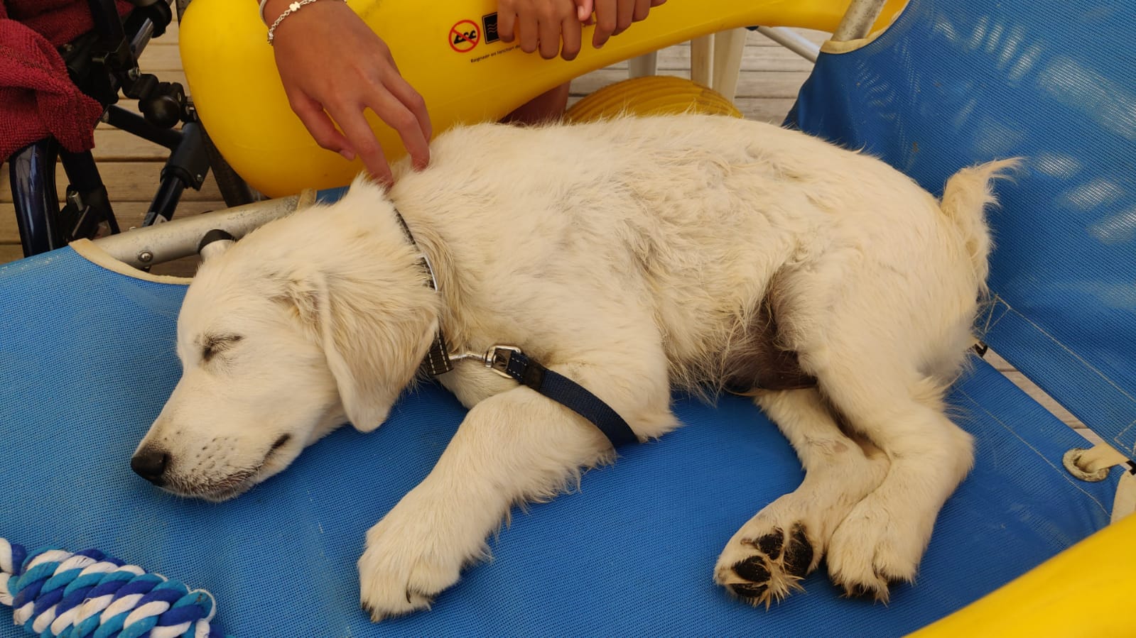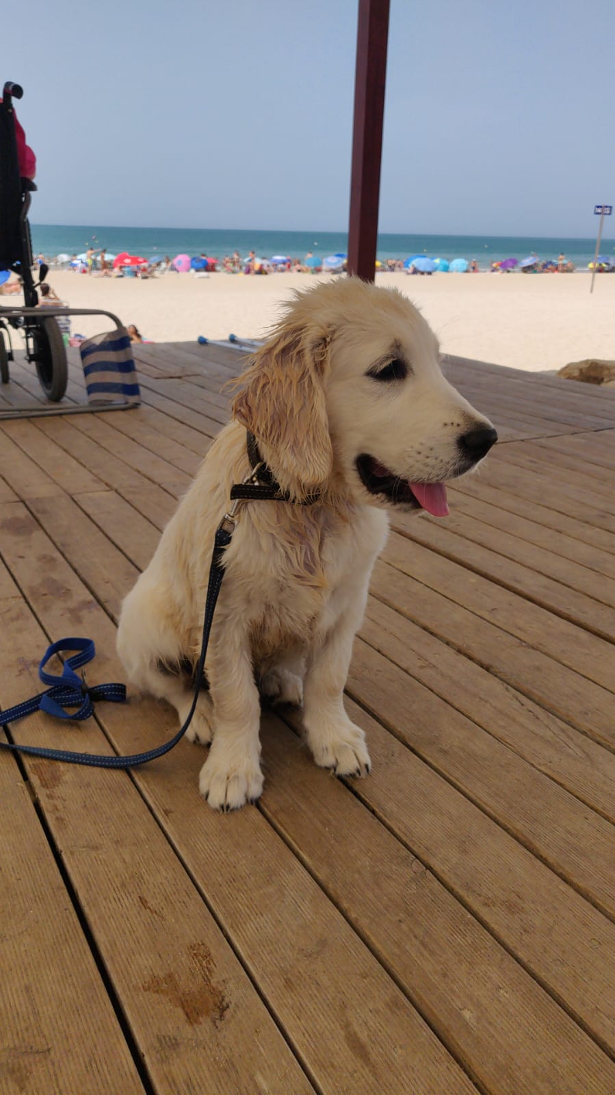 El golden retriever de tres meses ya ha comenzado su formación como futuro socorrista de Cruz Roja en la playa de La Barrosa en Cádiz. La iniciativa piloto ha sido presentada por Juan Luis de Castellví, un voluntario de la organización con larga experiencia en el adiestramiento canino.