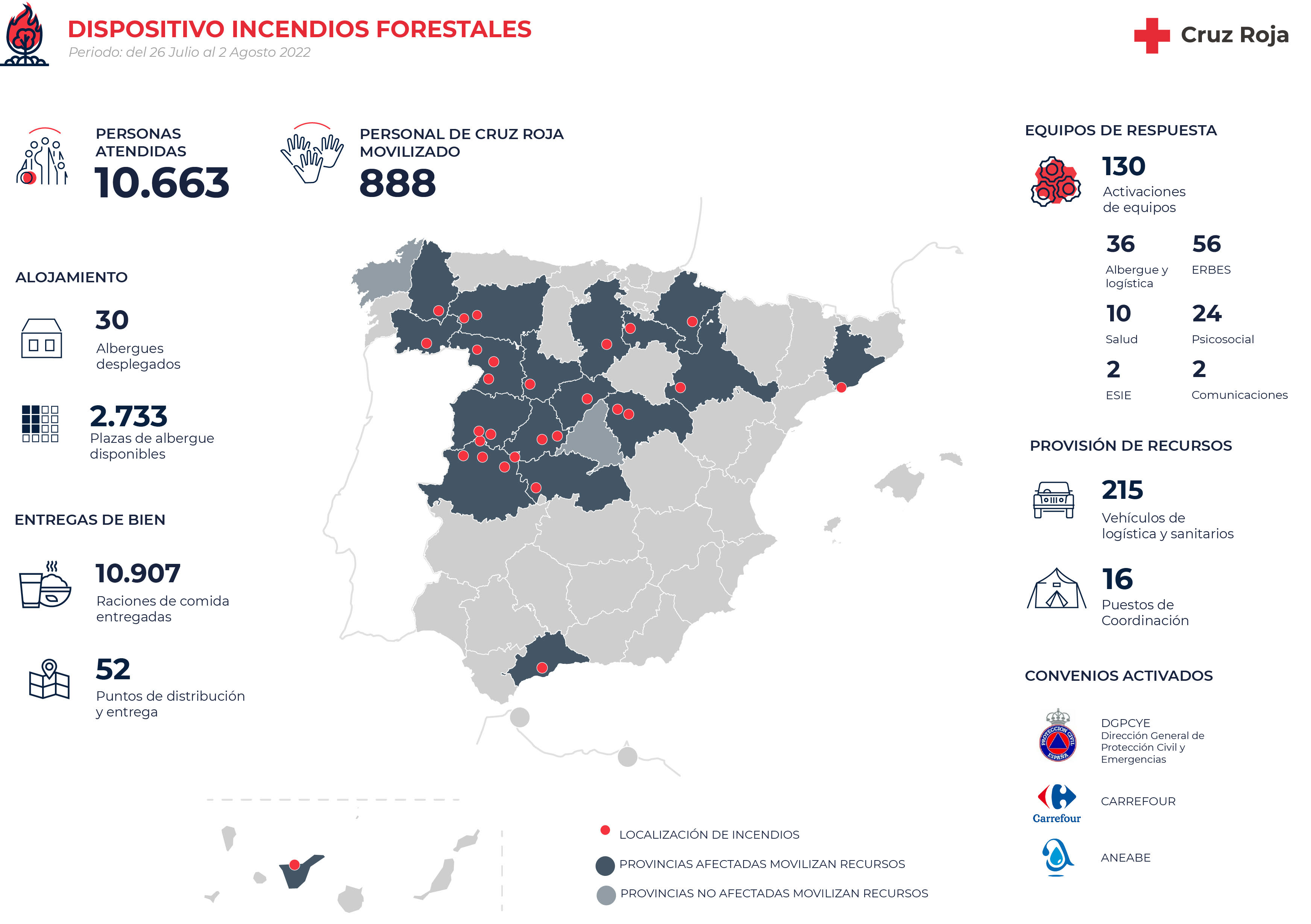 Cruz Roja está preparada durante todo el año para hacer frente a las consecuencias que se derivan de los incendios, pero es durante el verano cuando los equipos están más activos. Desde mediados de julio, se han atendido a más 10.600 personas a través de 130 equipos de respuesta básica en emergencias. Cruz Roja se encarga en estos casos de los albergues que activan para las personas que han tenido que ser desalojadas, también de las evacuaciones de las personas más vulnerables, ofrecen atención psicosocial a las personas afectadas además de las labores logísticas para dar cobertura a los intervinientes encargados de la extinción de las llamas.
