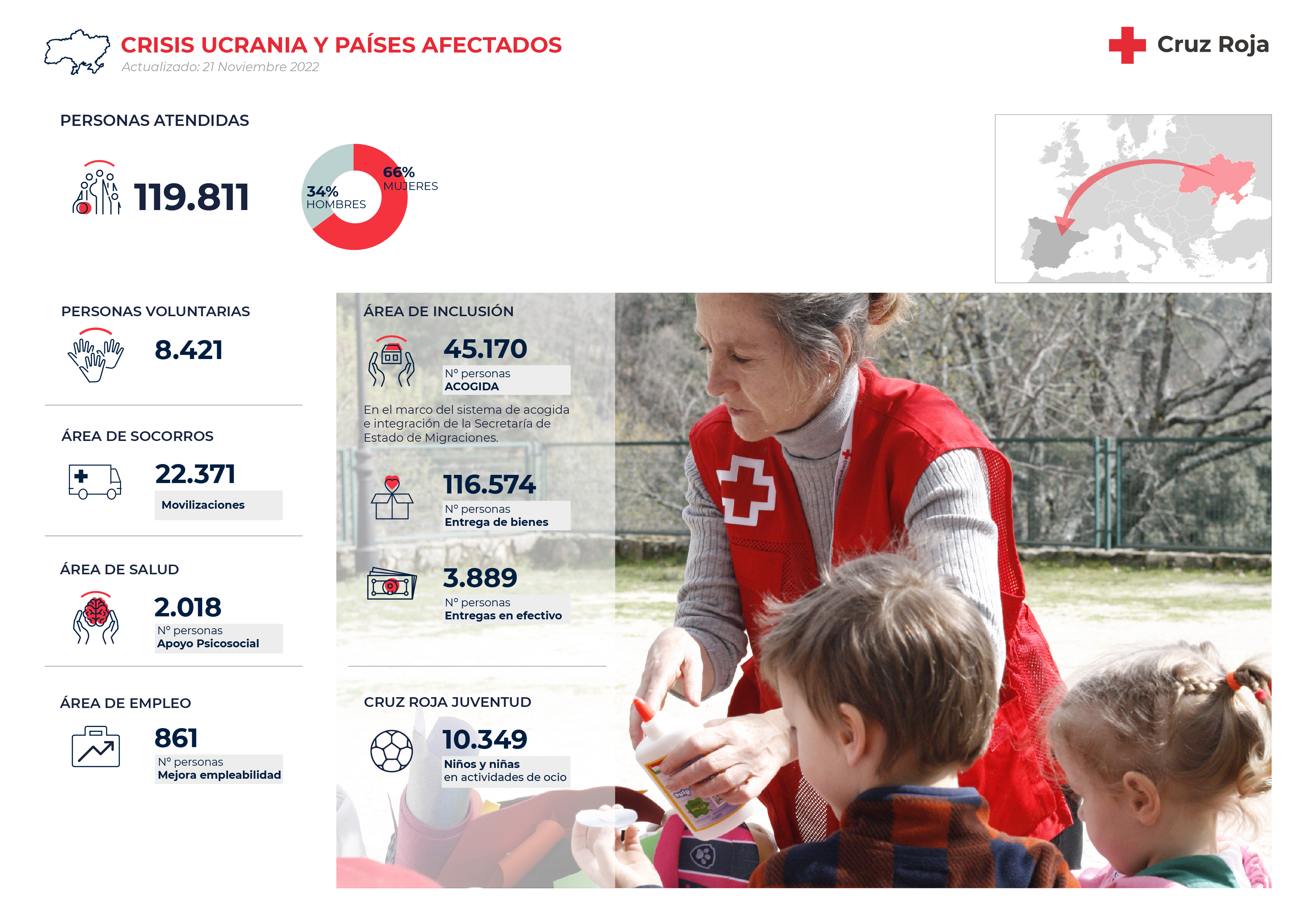Para hacerlo posible, más de 8.900 personas voluntarias han desarrollado su labor desde que comenzara el conflicto y hasta la fecha, lo que ha conseguido, entre otros hitos, que más de 1.024 personas hayan tenido una mejora de su empleabilidad, que 2.579 hayan tenido el apoyo psicosocial requerido, y 22.371 hayan podido contar con Cruz Roja para los desplazamientos hacia sus lugares de acogida.