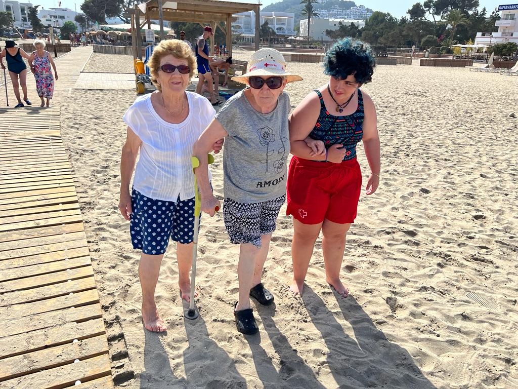 Cruz Roja en Ibiza ha puesto en marcha por segundo año ‘Mar de Amores’, un programa en el que el voluntariado acompaña cada semana a personas mayores con movilidad reducida a darse un chapuzón en las playas de Ibiza. Susi es voluntaria del programa de personas mayores y una de las personas que cada lunes ha acompañado a usuarios y usuarias a Cala Llonga para que pudieran disfrutar de esta playa. “Los recogemos en casa, paseamos con ellos y ellas por la orilla, los ayudamos a ponerse la crema y a que se bañen si les apetece, nos tomamos algo y sobre todo charlamos y les hacemos pasar un día agradable. Se lo pasan genial”, explica la voluntaria. La mayoría de las personas participantes del programa tienen movilidad reducida, pero son autónomas.