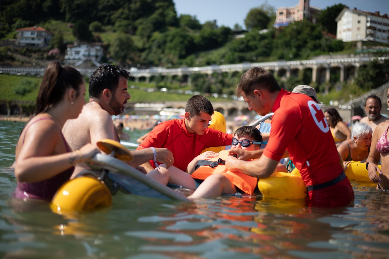 Además del equipamiento del que disponen desde Cruz Roja (silla anfibia, muletas andadoras, chalecos salvavidas…) y la oportunidad de disfrutar de un espacio adaptado tanto dentro como fuera del agua, el trato humano y el acompañamiento es un apoyo más para que las personas se sientan seguras y atendidas en todo momento.