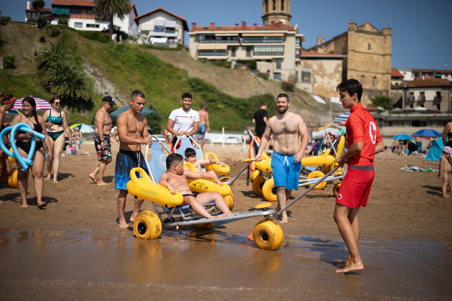 La distrofia muscular de Duchenne es una enfermedad que provoca debilidad muscular progresiva a edades tempranas. Las familias con hijos o hijas que padecen esta situación se encuentran con grandes complicaciones a la hora de acceder a zonas de ocio como, en este caso, las playas. Por ello, Cruz Roja en Gipuzkoa y la asociación Duchenne se unieron para ofrecer a estos niños, niñas y familias un día en el que no existieran barreras entre ellos, ellas y el mar. “El agua es el medio en el que estos niños se sienten libres, es el medio donde el cuerpo no pesa y donde se pueden mover con libertad”, afirma Vero Reyes, presidenta de la asociación y madre de un niño con distrofia muscular.