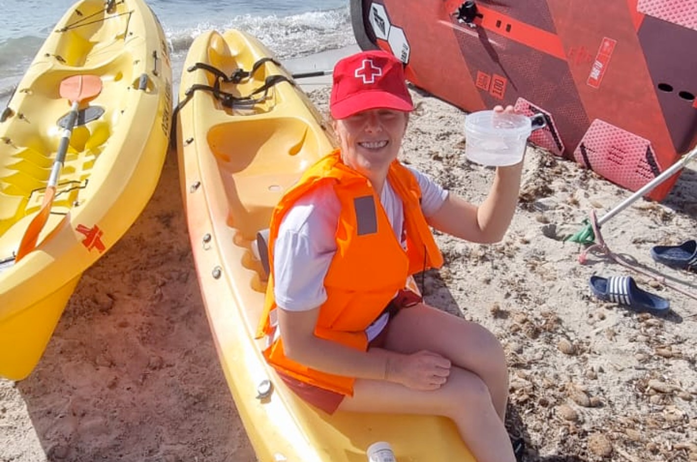 “Cuando vemos a alguna embarcación que ha fondeado sobre posidonia le pedimos si puede levantar el ancla y hacerlo sobre bancos de arena para, así, no dañar a la especie”, cuenta Erica, poniendo el foco en que dicha labor es meramente informativa. Y no es lo único que hacen. Junto a las tres personas voluntarias que suelen componer este proyecto, se reparten la faena: dos se meten en kayaks en el mar, y otras dos limpian los residuos que hay en la zona de la playa.