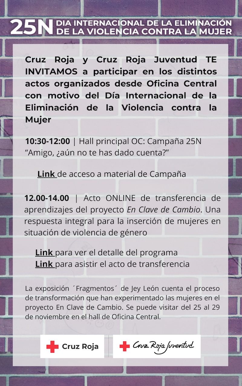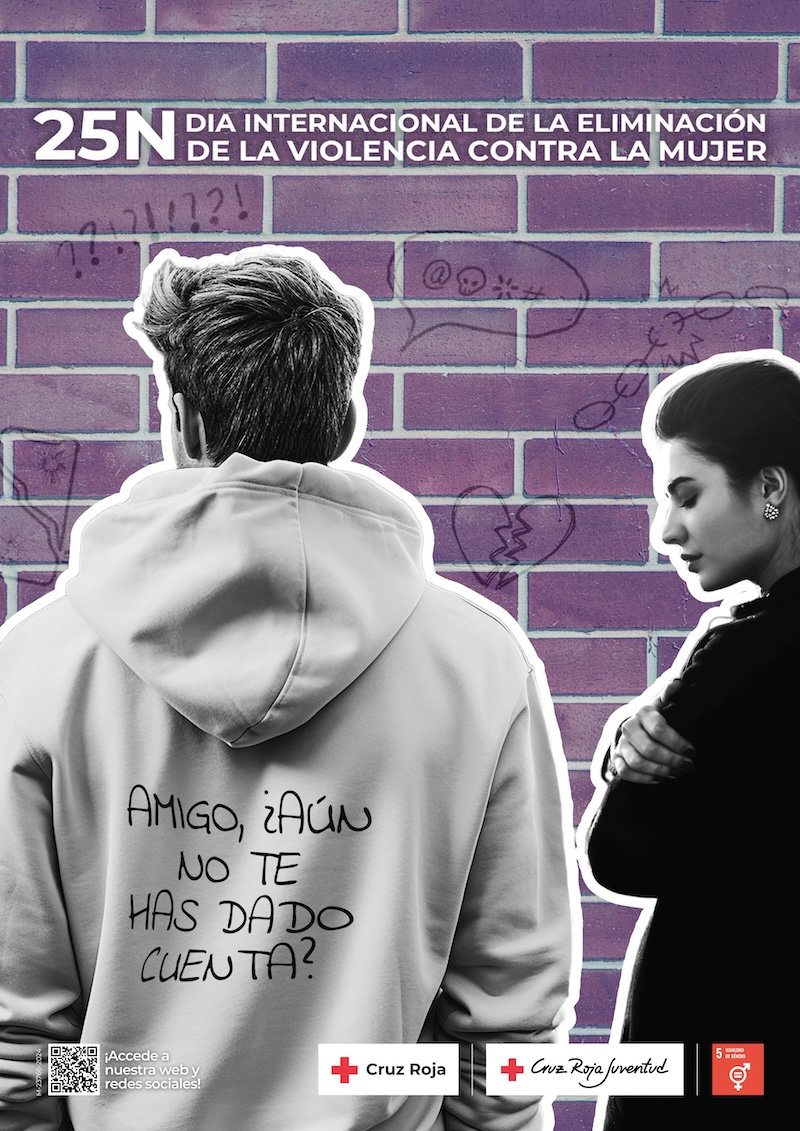 - Con motivo de la conmemoración del 25 de noviembre, Día Internacional de la eliminación de la violencia contra la mujer, Cruz Roja Juventud lanza su campaña ‘Amigo, aún no te has dado cuenta’, con la que busca concienciar a la sociedad sobre la detección temprana de comportamientos nocivos en la pareja y en la implicación activa de los hombres en la erradicación de la violencia machista.