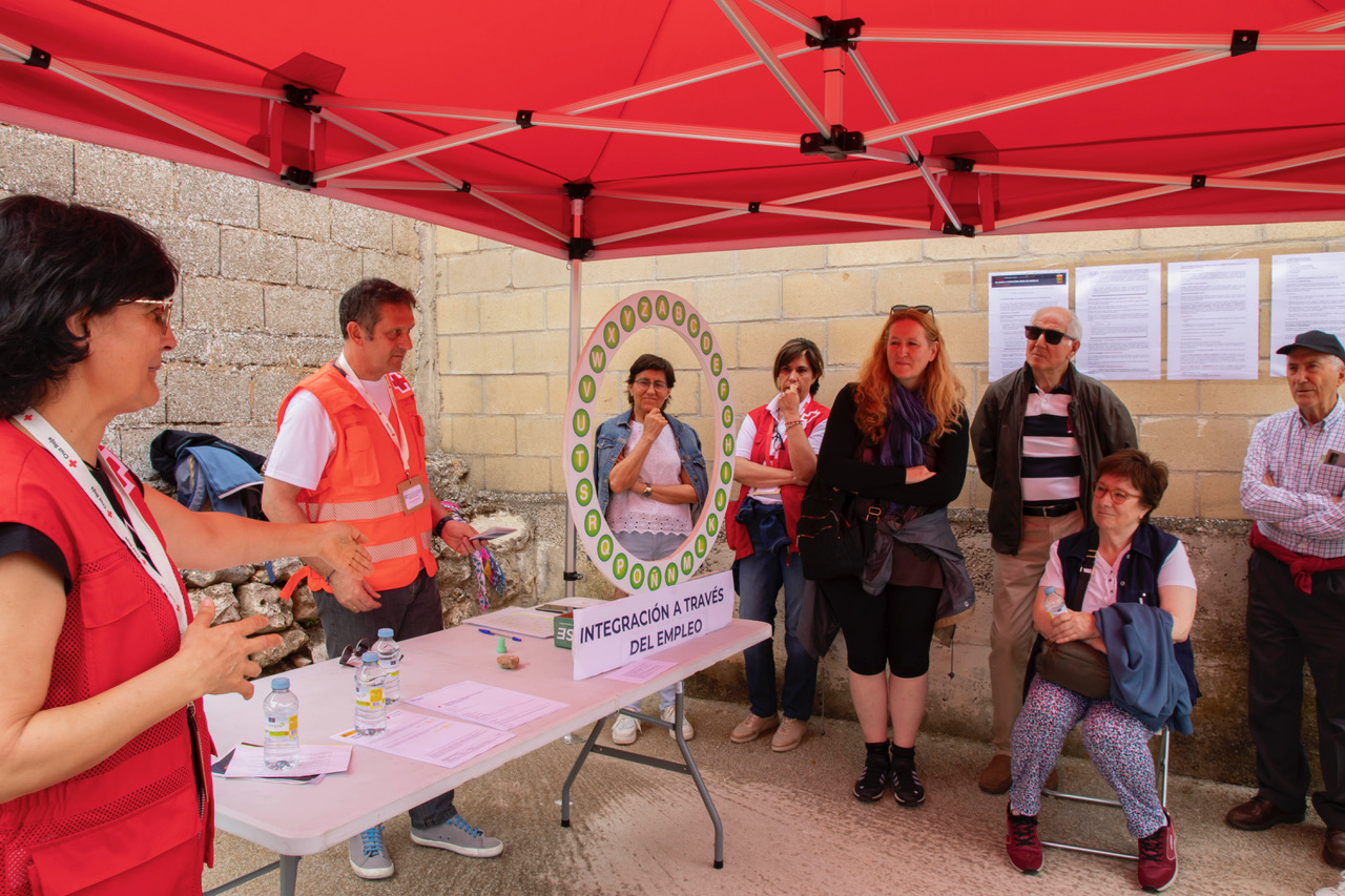 Se formaron grupos de entre 8 y 10 personas voluntarias para recorrer diferentes puntos del pueblo, como el centro social, el centro de salud, la Plaza Mayor y el pórtico de la Iglesia. Cada punto simulaba un área de trabajo del Programa de Personas Refugiadas, abordando temas como trámites de documentación, empleo, atención sanitaria, situaciones específicas (trata, violencia de género), juventud, aprendizaje del idioma, acceso a vivienda, redes de apoyo y trayecto migratorio.