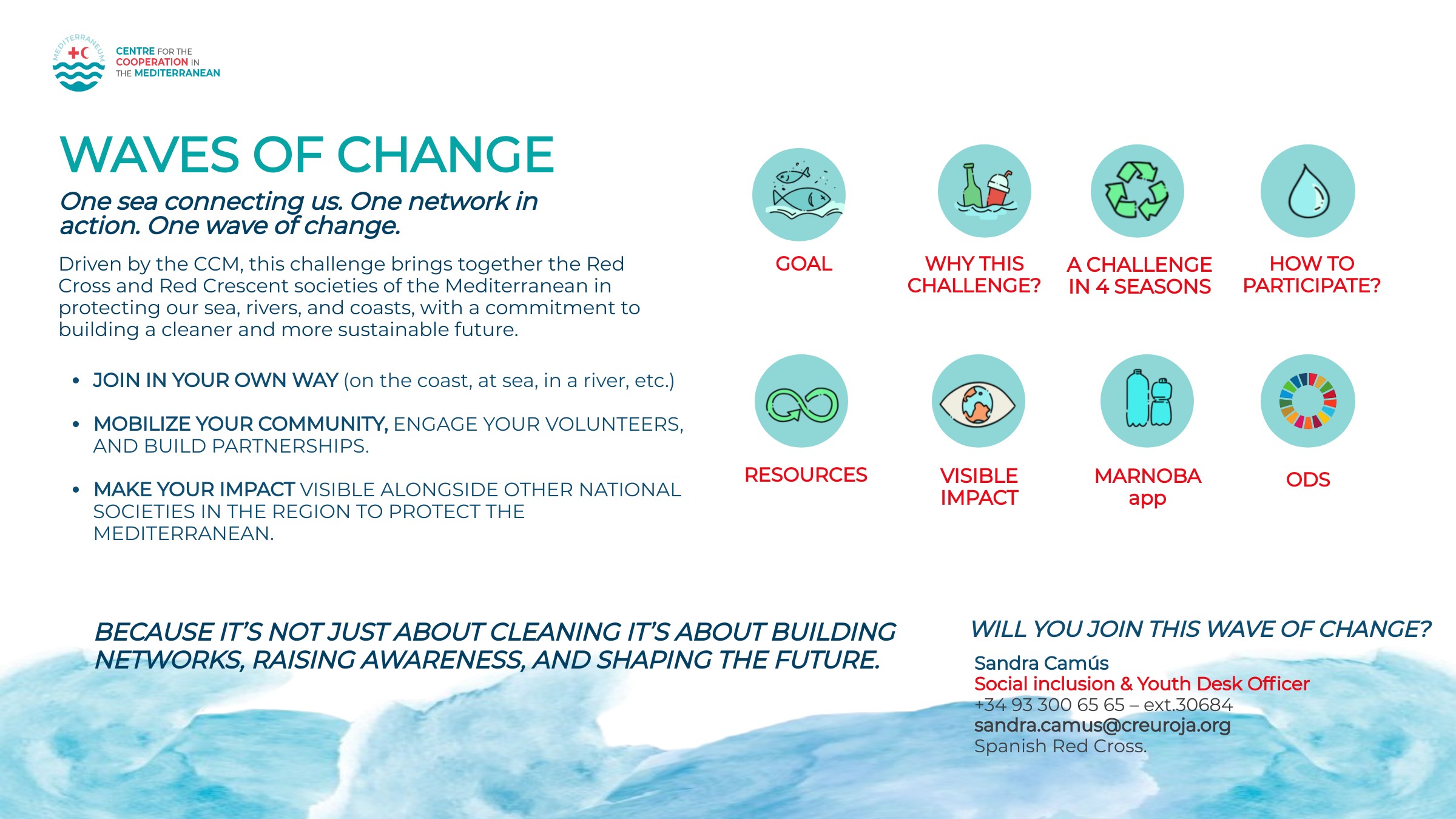 La Méditerranée nous relie tous, et ensemble nous pouvons faire la différence. “WAVES OF CHANGE” est un défi annuel lancé par le Centre pour la Coopération en Méditerranée qui invite toutes les Sociétés Nationales de la région méditerranéenne à agir localement pour protéger nos mers, rivières et côtes, tout en créant un impact collectif visible et durable.