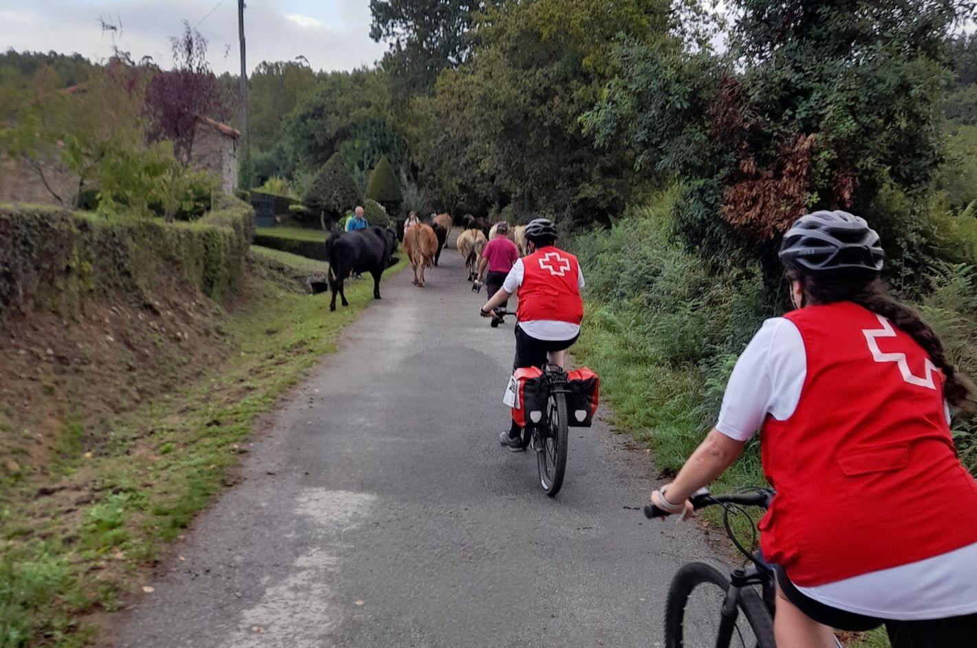 Acompañamiento, asistencia y asesoramiento son las principales funciones del dispositivo “Contigo no camiño” que lleva realizando la Organización en Galicia desde el año 2021 con el apoyo de la Xunta de Galicia. Desde el 26 de agosto hasta el 30 de septiembre un equipo de socorristas de Cruz Roja recorre por completo, en bicicletas eléctricas, las etapas del Camino Francés entre Sarria y la ciudad de Santiago de Compostela con el objetivo de proporcionar cobertura a lo largo de 117 kilómetros. “Nos da la opción de 'estar ahí', una simple frase que significa mucho para aquellos peregrinos que tal vez no necesiten un traslado sanitario urgente, pero sí que les tiendan una mano, que les den consejo en los momentos de incertidumbre o simplemente que les den una palabra de ánimo. Para muchos peregrinos, marca la diferencia entre abandonar o continuar con su camino”, asegura Rodrigo Montero, coordinador del dispositivo.