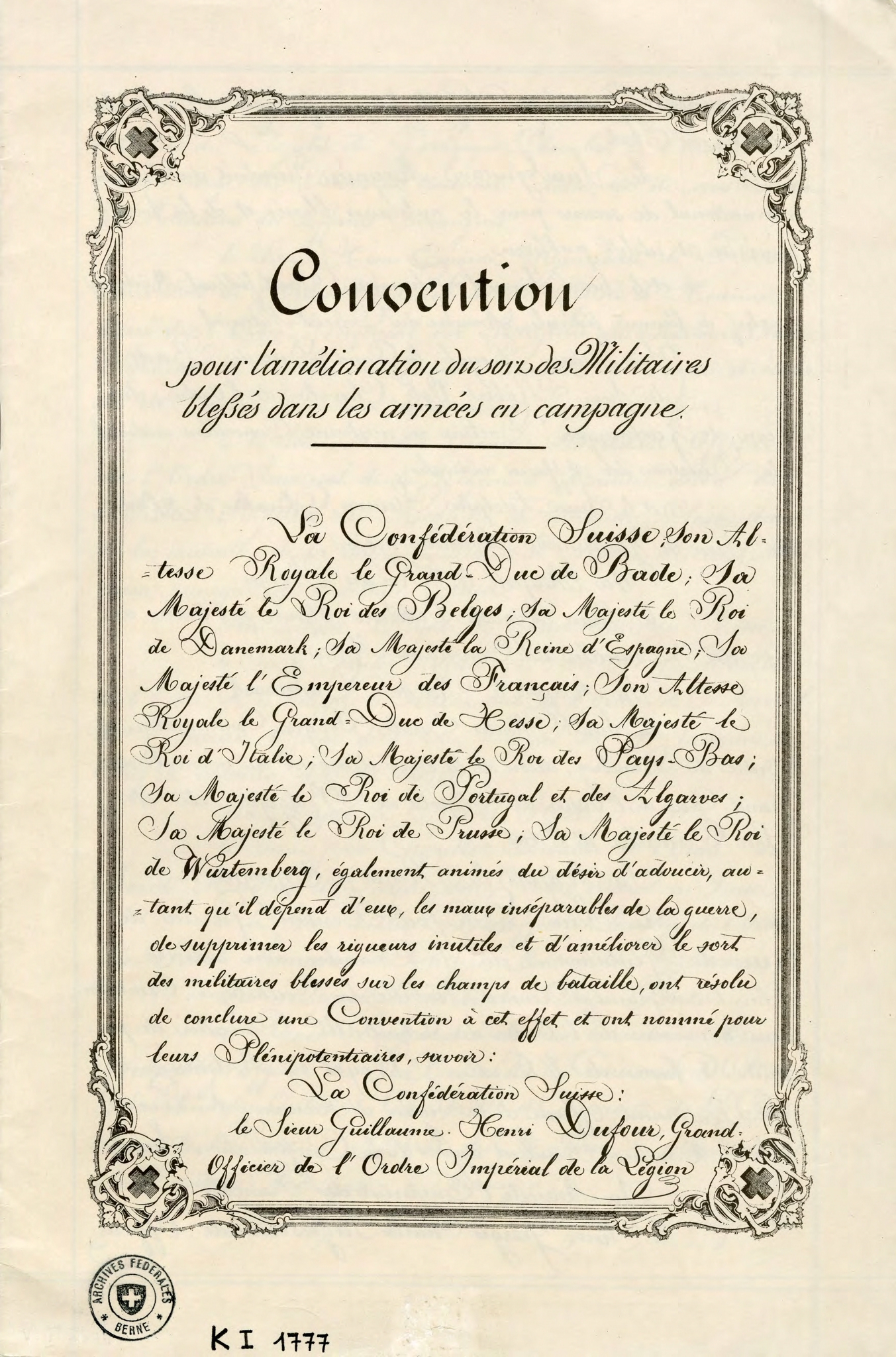 Era 22 de agosto. Ese día, del año 1864, concluía la conferencia internacional en Ginebra (Suiza). Una fecha histórica en la que 12 países firmaron un documento por el que se comprometían a amparar y proteger a los soldados heridos, así como a las personas y equipamiento dedicados a su cuidado en un conflicto bélico. Un tratado que fue el germen del actual Derecho Internacional Humanitario, y que fue puesto en práctica por primera vez solo dos años más tarde durante la guerra austro-prusiana. Henry Dunant, fundador de la Cruz Roja, fue uno de sus principales impulsores.