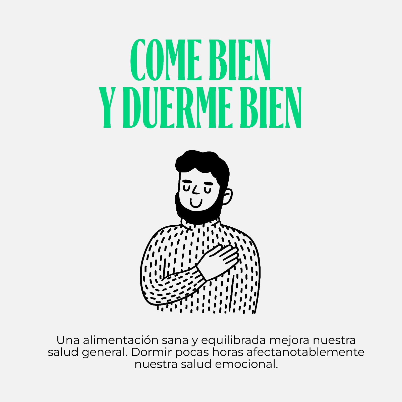 Una alimentación sana y equilibrada mejora nuestra salud general y, por tanto, nuestra salud mental. Cuida también tus hábitos de descanso: una mala higiene del sueño nos produce cansancio y perjudica notablemente nuestra salud emocional.