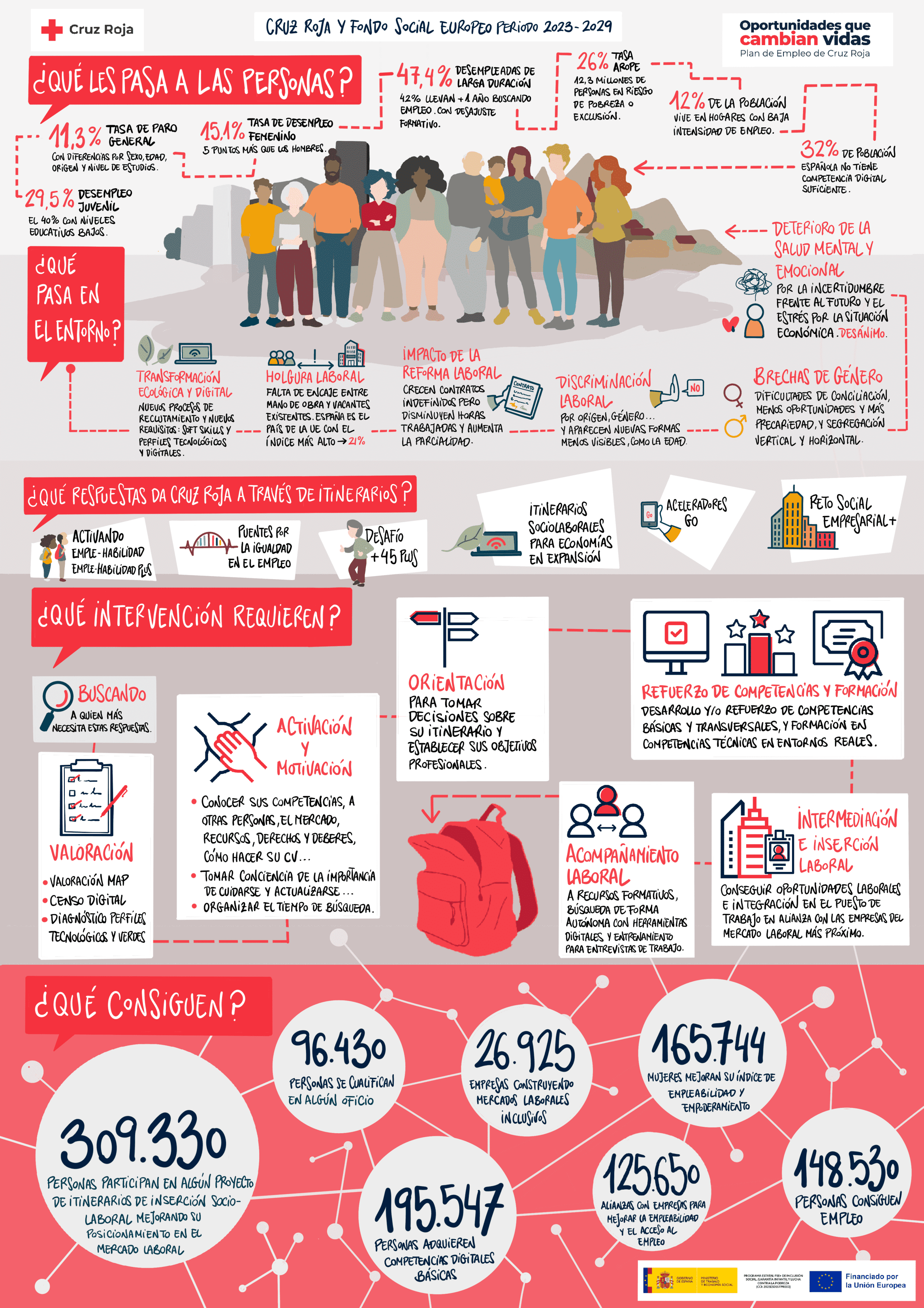 El Plan de Empleo de Cruz Roja trabajo tanto con las personas afectadas por el desempleo como con el entorno. Con un 11.3% de tasa de paro general, un 15.1% de tasa de paro femenino y un 47.4% de desempleados de larga duración, Cruz Roja arropa a quienes más difícil lo tienen para acercase al mercado laboral; lo jóvenes, tienen un 9.5% de desempleo, y hay hasta 12.3 millones de personas en riesgo de pobreza o exclusión, además de que un 12% de la población vive en hogares con baja intensidad de empleo, o no tienen competencias digitales en un 32% de los casos.