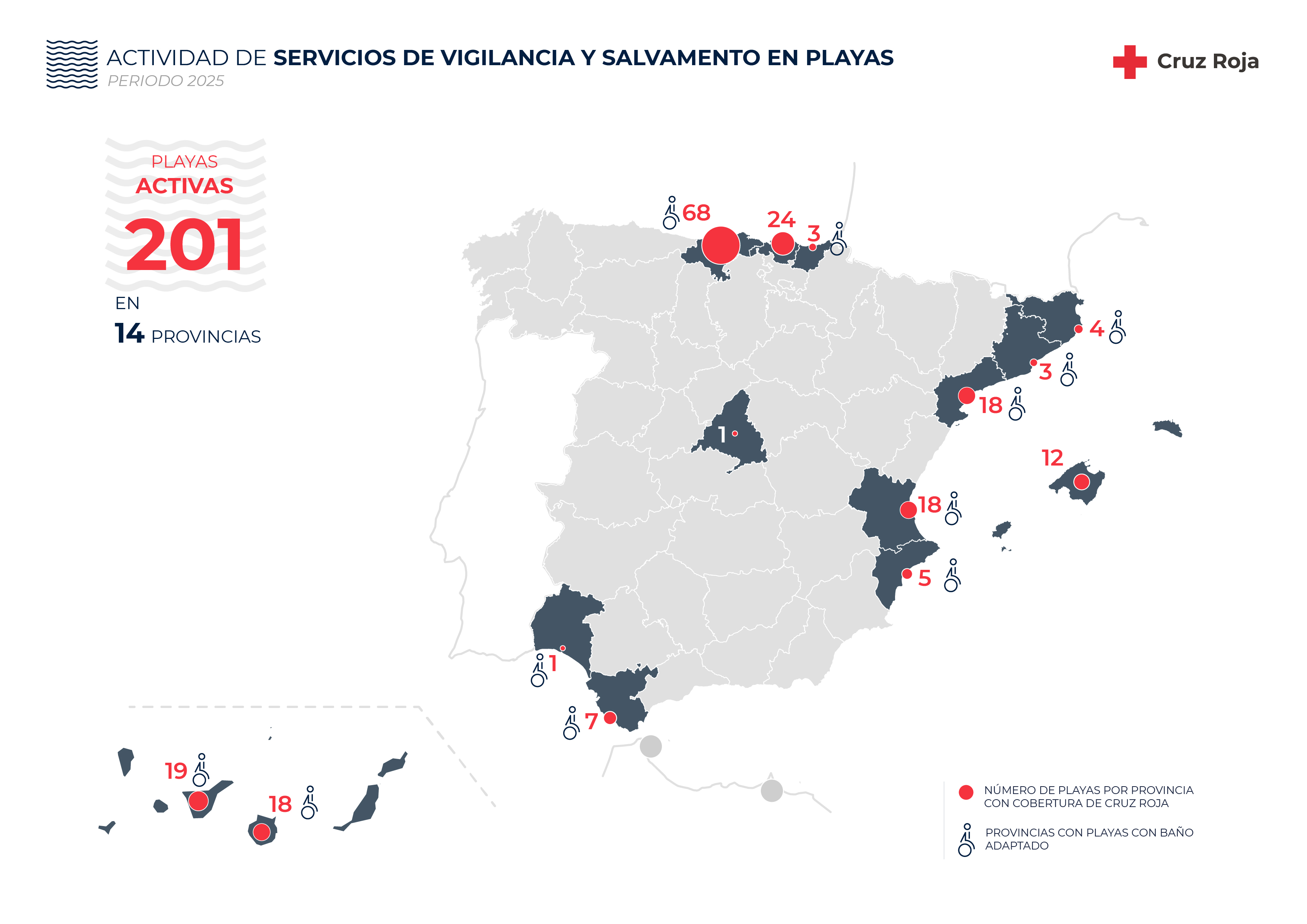 Cruz Roja pone al servicio de las personas que visitan la playa, a todo su personal cualificado y material adecuado, para dar la mejor respuesta a todas aquellas que lo necesiten. Tanto desde el punto de vista sanitario como social. Nuestra labor se centra en salvar todas las barraras existentes para que las personas disfruten de un baño seguro. Para ello, nuestro personal, a través de su capacitación y de las ayudas técnicas dispensadas en las zonas de baño y ocio adaptado, damos soporte a las personas con movilidad reducida. Además, cada año, estamos muy atentos a la búsqueda de personas (niños y adultos) que se puedan desorientar en la playa.