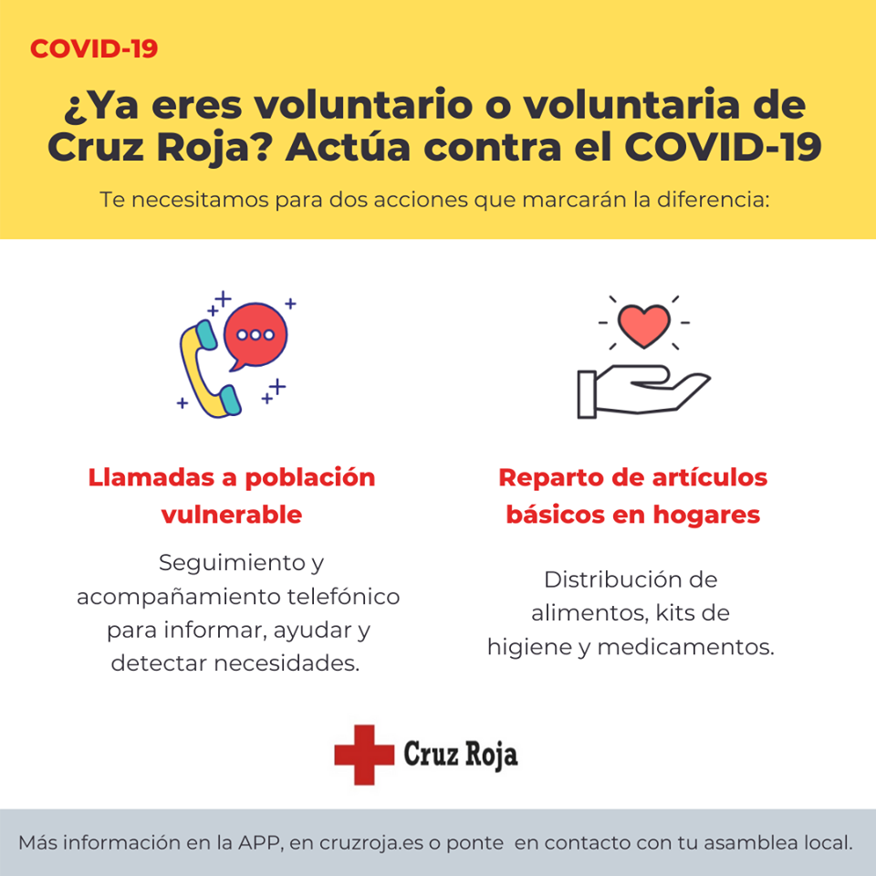 Si eres voluntario o voluntariay quieres actuar ante el COVID-19, consulta la app de Cruz Roja o contacta con tu Asamblea Local más cercana.