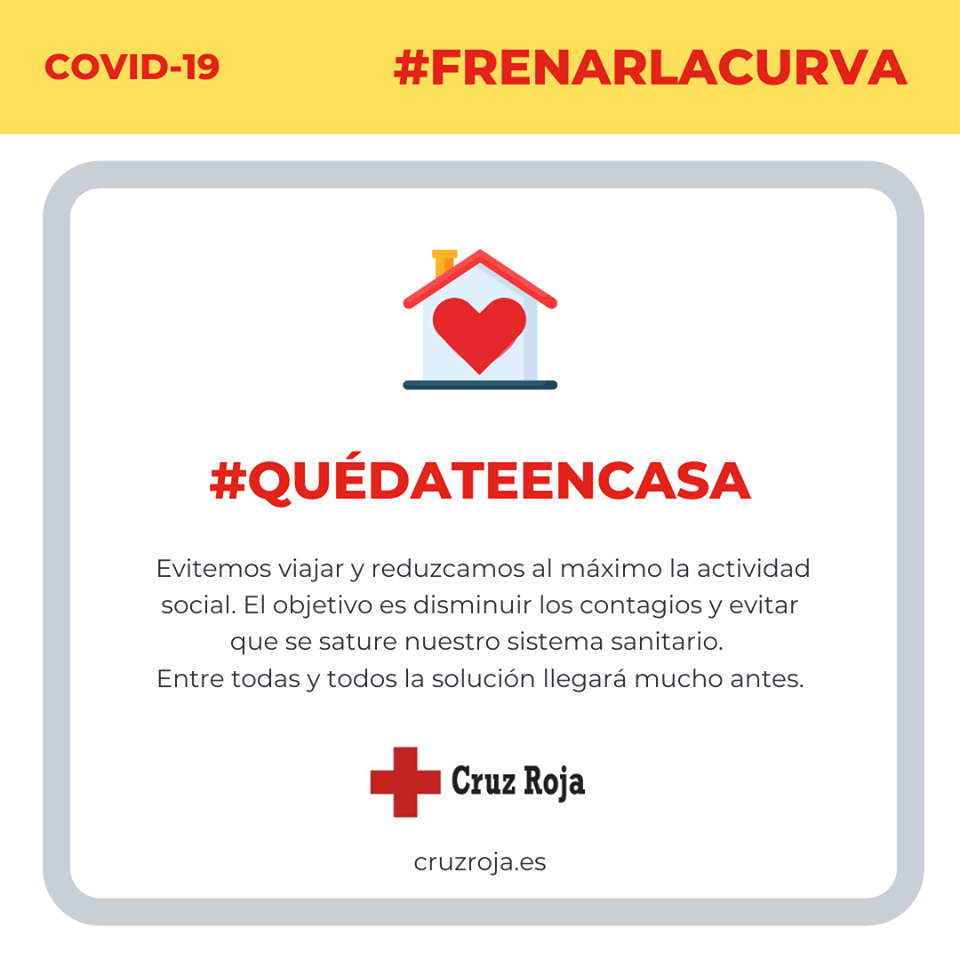#QuédateEnCasa y contribuye a #FrenarLaCurva: desde Cruz Roja Española insistimos en la importancia de “quedarse en casa” como medida más eficaz para contener la infección y prevenir la aparición de nuevos casos. Comparte esta imagen con tus contactos para convencerles si hace falta.