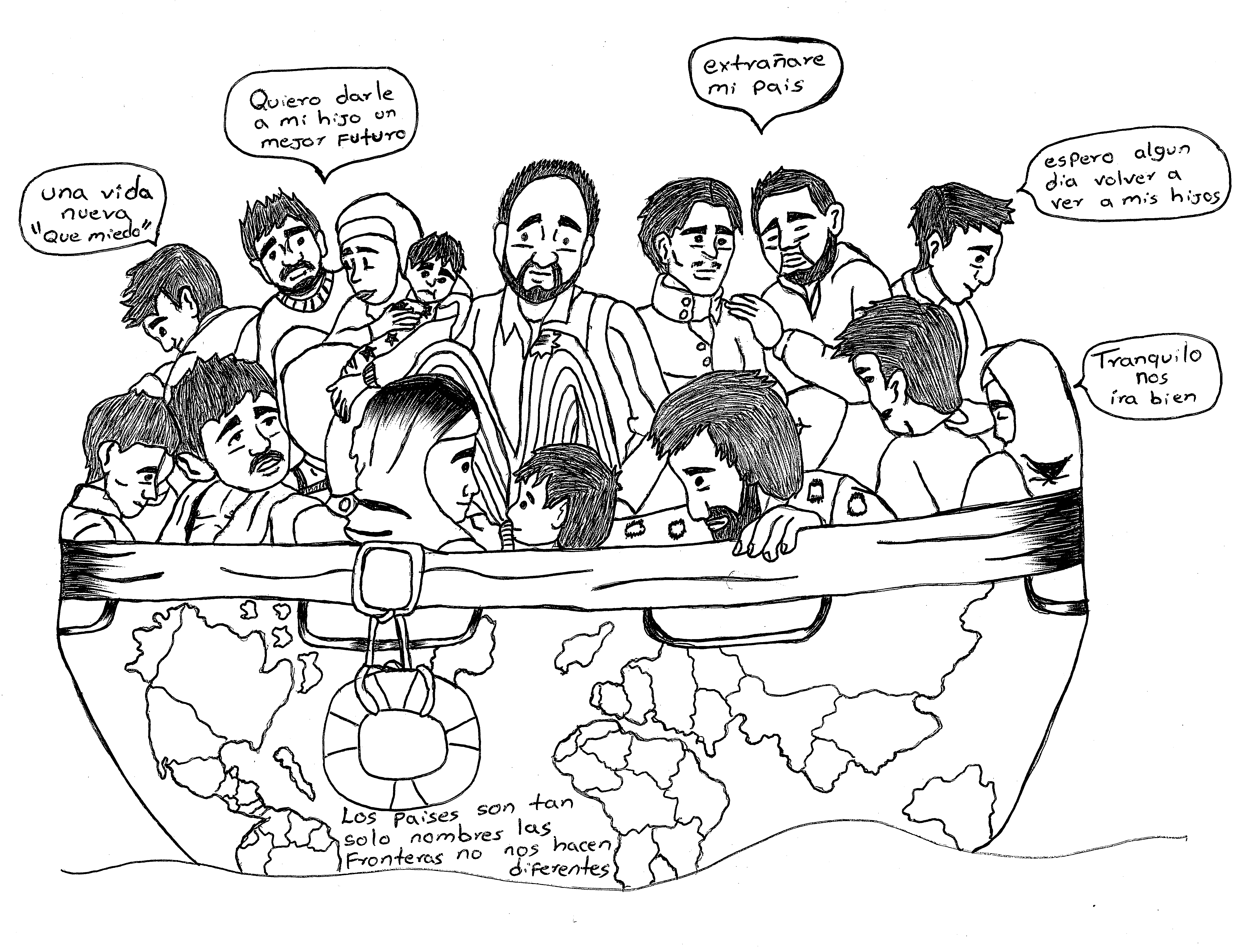 Las mujeres representan la justicia ciega y sorda, la injusticia que tiene cada país. El astronauta con las banderas representa cada emigrante y sus países, con la mirada al frente, dispuesto a seguir adelante. Las olas del mar con la palabra familia refleja la importancia de esta. Siempre va estar con nosotros sin importar dónde nos encontremos. La brújula, con el ancla y el mapa nos acompañan en el camino hacia nuevas tierras, donde se presentan oportunidades. El cielo se distinguen dos zonas. La parte más oscura representa las emociones en el momento de partir y dejar todo atrás. La parte más luminosa representa las oportunidades, nuevos comienzos, nuevas culturas y la esperanza de algún día volver a ver a tus seres queridos.