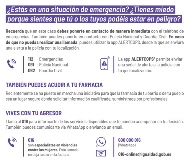 Tenemos que recordar, asimismo, que está a nuestra disposición el 016, un teléfono de información y asesoría jurídica gratuita en funcionamiento las 24 horas. En este sentido, también existe la opción de enviar un mail a 016-online@igualdad.gob.es, o contactar por WhatsApp a través del siguiente número: 600 000 016. Este servicio es gratuito, confidencial, accesible para personas con discapacidad auditiva y/o del habla y baja visión, y está disponible en 53 idiomas las 24 horas, entre otros aspectos que se pueden conocer en mayor profundidad en esta página web.