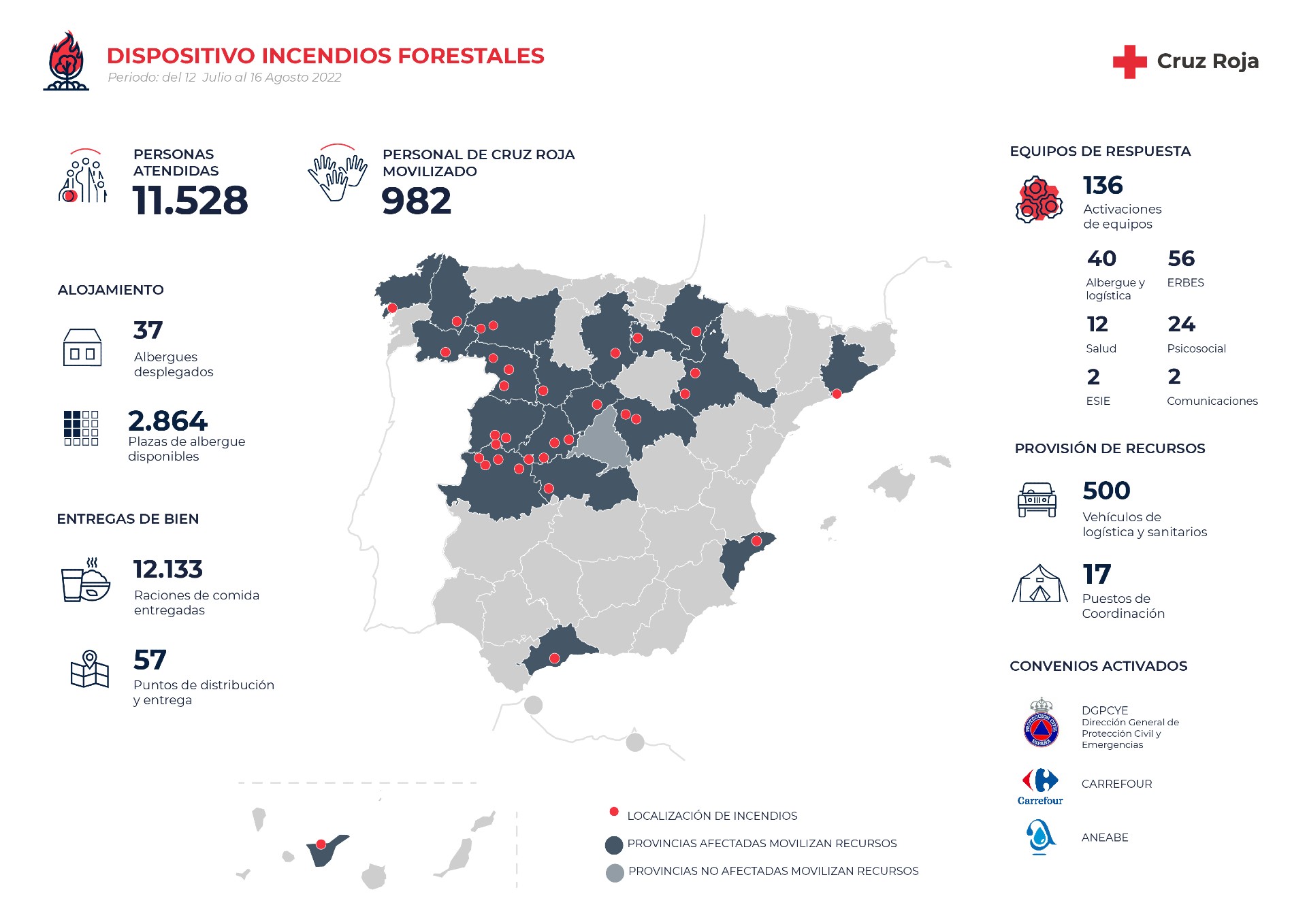 Abuztuaren 16ra arte, 11.528 pertsona artatu dira, eta Gurutze Gorriko 982 langile mobilizatu dira, erakundeak baso-suteetarako zabaldutako dispositiboaren barruan. Ostatuari dagokionez, 37 aterpetxe zabaldu dira guztira eta 2.864 plaza erabilgarri daude. Ondasunak entregatzeari dagokionez, 12.133 janari-anoa banatu dira 57 banaketa- eta entrega-puntutan.