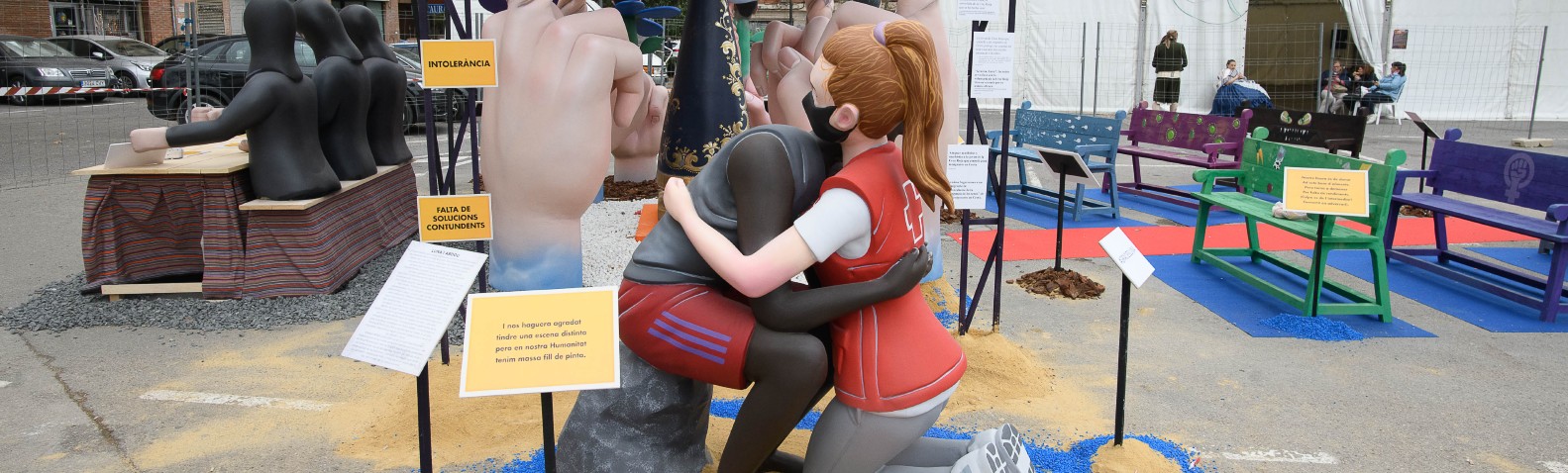 El ‘ninot’ del abrazo de Luna a Abdou que representa la Humanidad que guía a Cruz Roja
