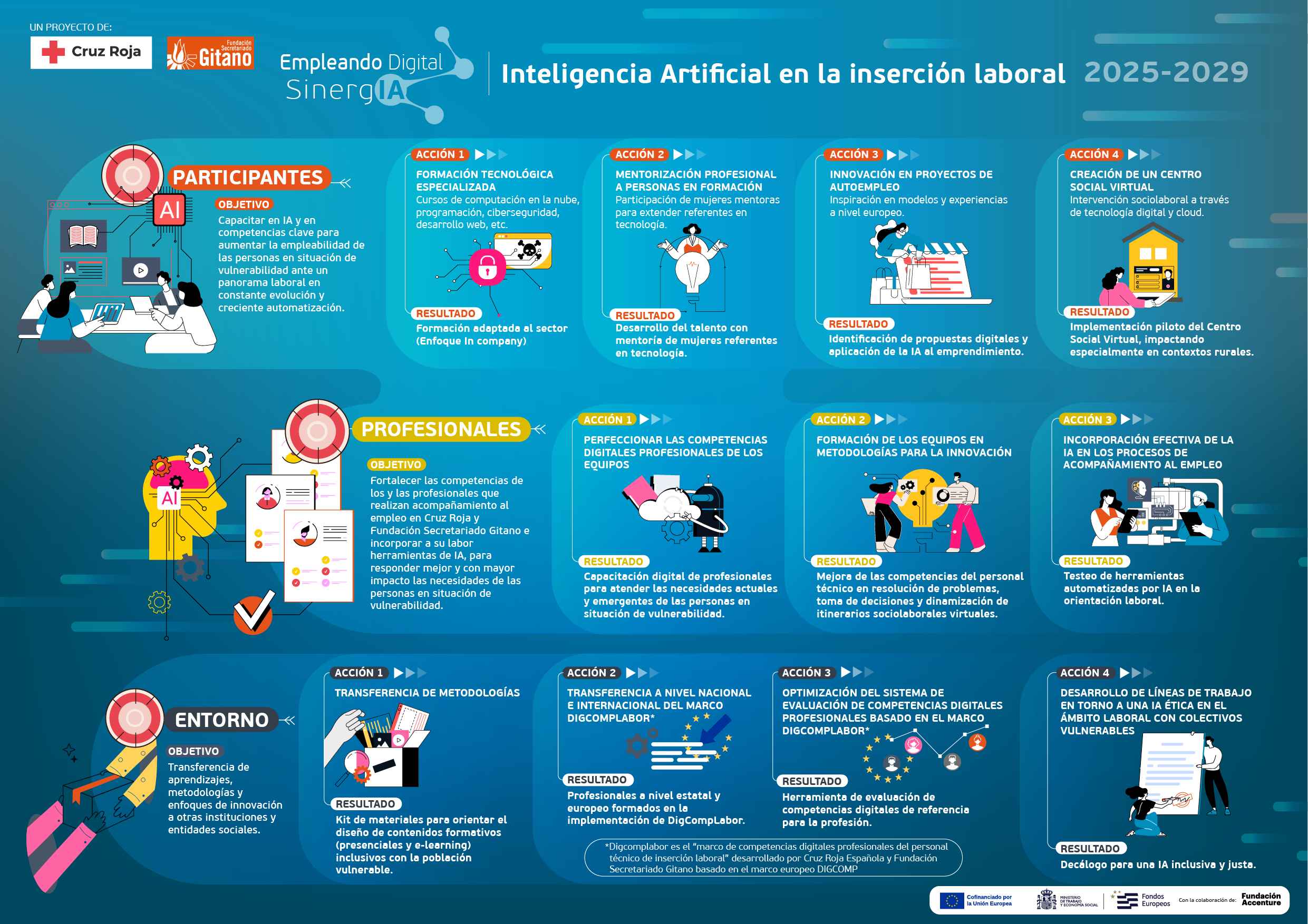 Este innovador proyecto, impulsado por Cruz Roja Española y la Fundación Secretariado Gitano con la cofinanciación de la Fundación Accenture y el Fondo Social Europeo Plus (FSE+) apuesta por poner la tecnología al servicio de las personas, especialmente de quienes más lo necesitan. Su propósito es claro: transformar la inserción laboral mediante el uso ético, estratégico e inclusivo de la inteligencia artificial, asegurando que nadie se quede atrás.
