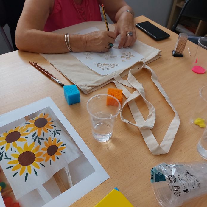Los talleres impartidos durante el campamento han sido de lo más diversos. Han aprendido a sacar cita en el médico desde sus dispositivos móviles, a decorar una tote bag, participaron en un bingo musical, asistieron a juegos de memoria y hasta utilizaron gafas virtuales. Y, como la intención de la Organización con este campamento es realizar un trabajo integral en el que las personas mayores reforzaran no sólo su lado emocional, sino el físico, contaron con talleres de gimnasia. “La movilidad a estas edades es fundamental. Yo me encargo de hacer ejercicio físico con ellos y ellas. La idea es que se entretengan, les parezca divertido, no se les haga pesado y lo puedan hacer después en sus casas”, cuenta Juan Luis, voluntario.
