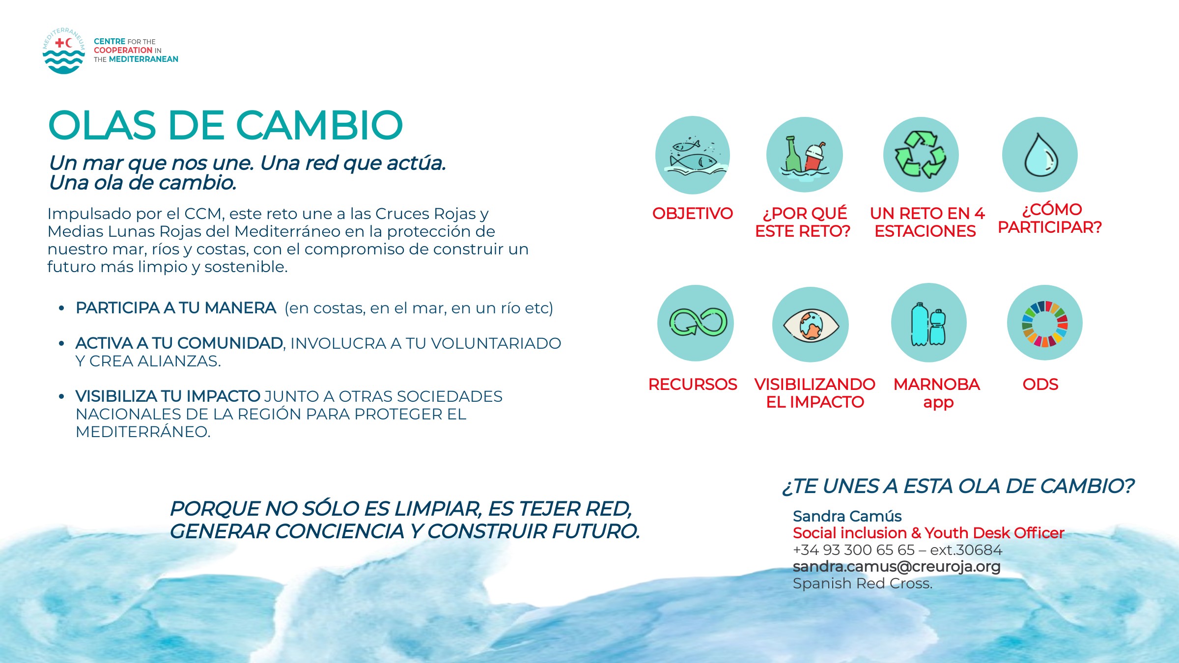 El Mediterráneo nos conecta a todos, y juntos podemos marcar la diferencia. “WAVES OF CHANGE” es un reto anual lanzado por el Centro para la Cooperación en el Mediterráneo que invita a todas las Sociedades Nacionales del Mediterráneo a actuar localmente para proteger nuestros mares, ríos y costas, mientras creamos un impacto colectivo visible y duradero.