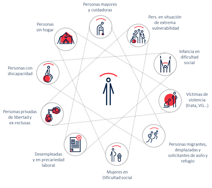 La labor de las Sociedades Nacionales mediterráneas abarca un amplio abanico de actividades como la cobertura de necesidades básicas, la gestión de centros de acogida, el acompañamiento legal, el apoyo para el acceso al empleo y a la educación, las acciones para hacer frente a la soledad, entre otras, con especial atención a personas en situación de extrema vulnerabilidad, personas mayores, niños y niñas en dificultad social, personas con discapacidad, personas reclusas y ex reclusas, personas migrantes, mujeres en dificultad social y cualquier otro colectivo en situación de vulnerabilidad.