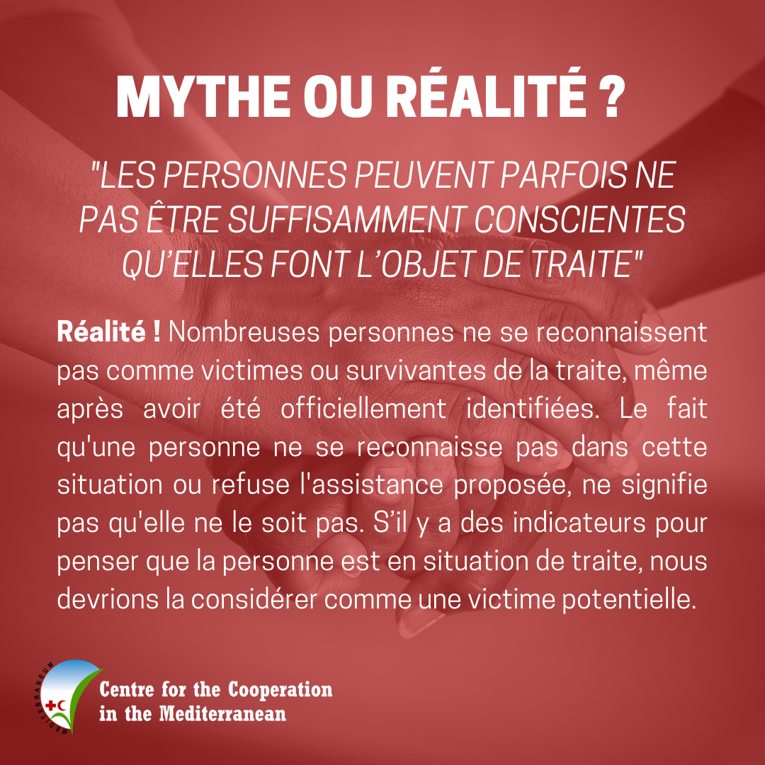 Le Centre pour la Coopération en Méditerranée soutient et encourage des initiatives visant à sensibiliser et à promouvoir une meilleure connaissance de la traite des êtres humains parmi les volontaires et le personnel des Sociétés nationales, des groupes spécifiques et le grand public. Il encourage également les actions conjointes entre les Sociétés nationales afin de renforcer le travail collaboratif et de mise en réseau - notamment en soutenant le groupe méditerranéen de jeunes éducateurs/éducatrices et formateurs/formatrices - et maintient un contact étroit avec l'ATN (Réseau d'action des Croix-Rouges européenne contre la traite des êtres humains).