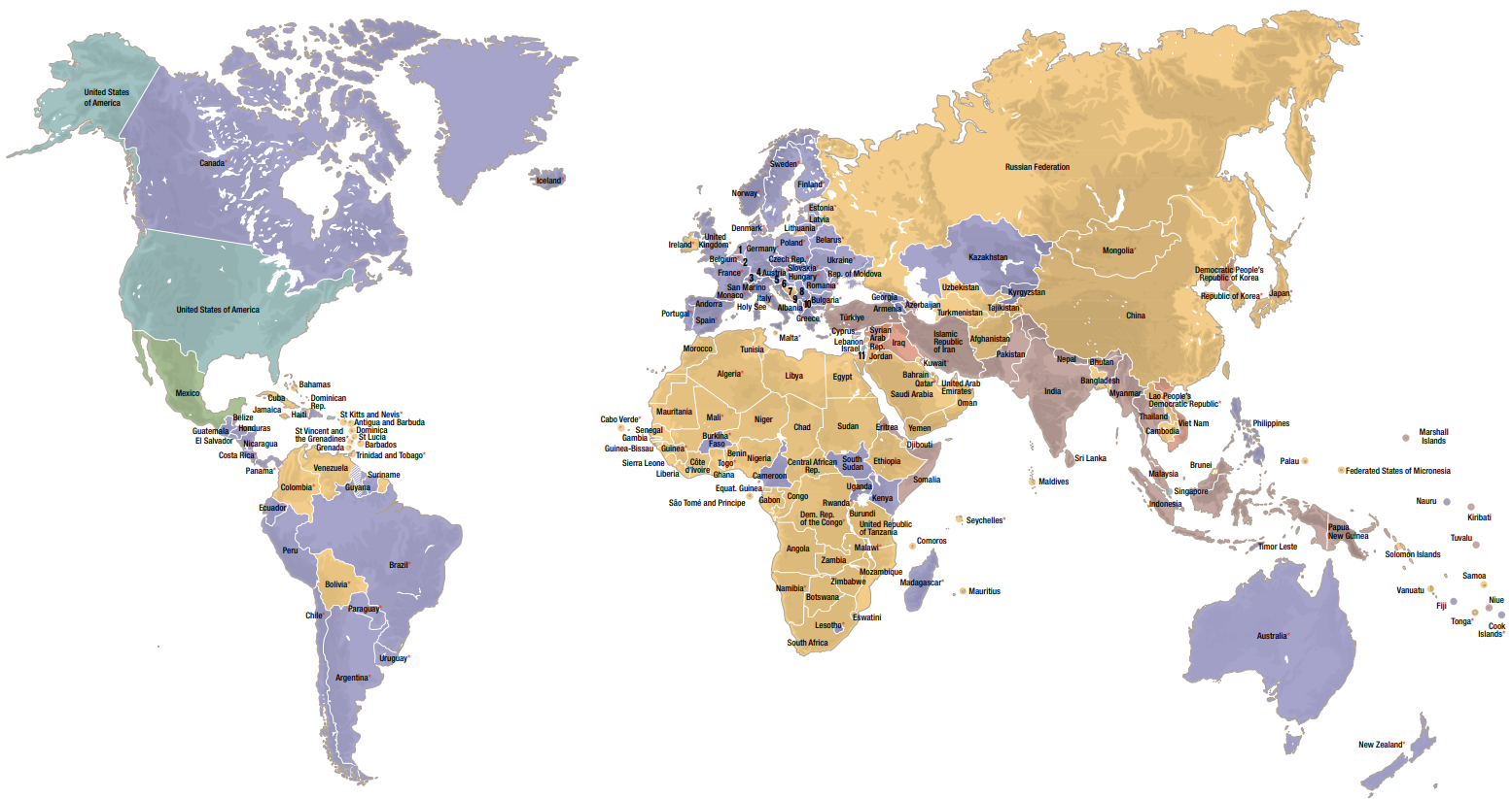 Este mapa muestra qué Estados eran parte en los Convenios de Ginebra de 1949 y de sus Protocolos Adicionales a 31 de diciembre de 2023 (CICR. Informe Anual, volumen II. Pp. 532-533. 2023). También indica qué Estados habían hecho la declaración facultativa en virtud del artículo 90 del Protocolo Adicional I, reconociendo la competencia de la Comisión internacional de Encuesta.